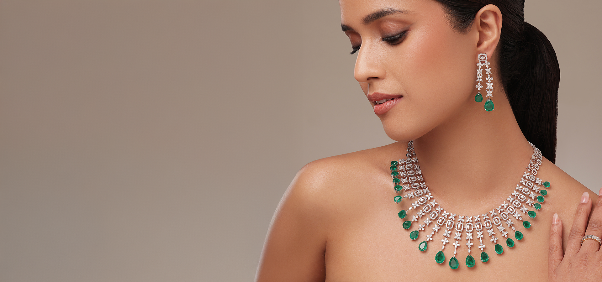 Pair a classic diamond necklace with Stud Earrings for a polished everyday look, or go bold with a Neckline and matching Statement neckEarrings for weddings and special occasions. Our designs are versatile enough to suit everything from formal gowns to ethnic wear.