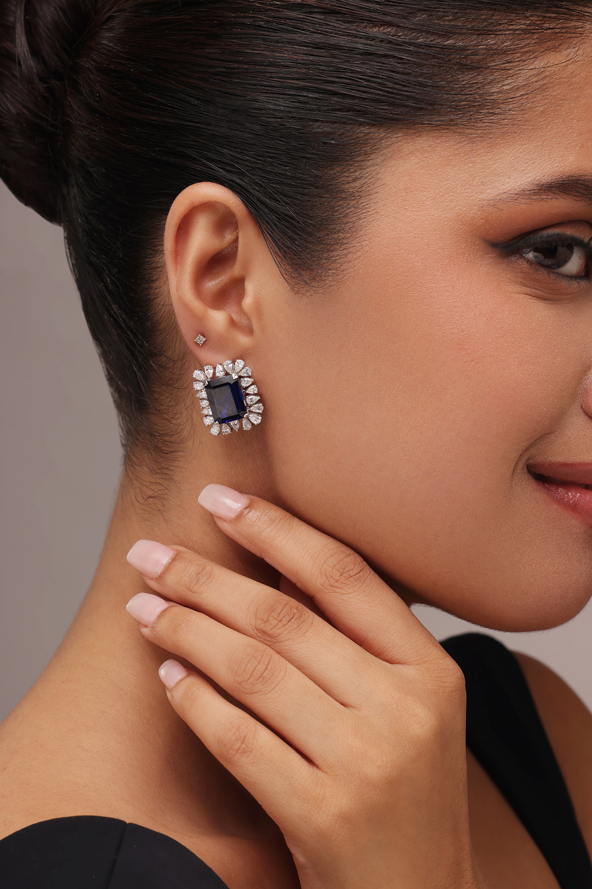These striking stud earrings feature a beautiful blue, rectangular stone at the center. It's surrounded by a starburst of sparkling pear-shaped lab-grown diamonds, creating a bold and classic look