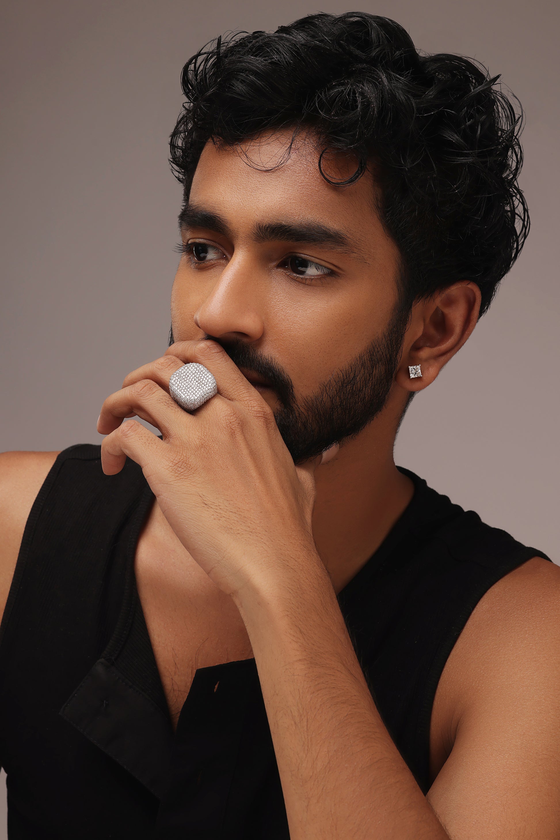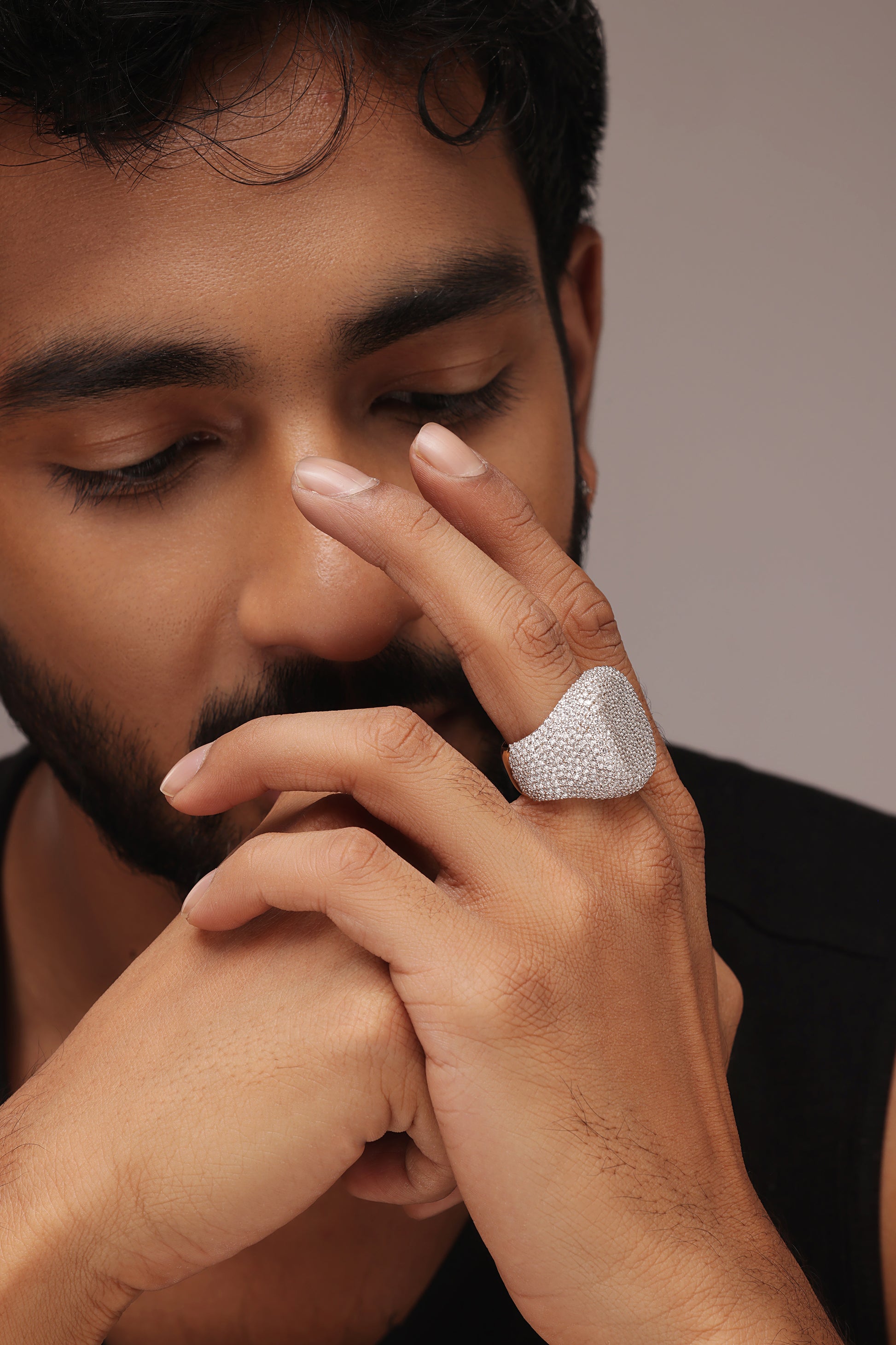 This unique men's ring features a single, horizontally set baguette-cut diamond as its focal point. The diamond is bezel-set, and the band is adorned with a striking pattern of geometric pyramid-like shapes, giving it a modern and edgy look.