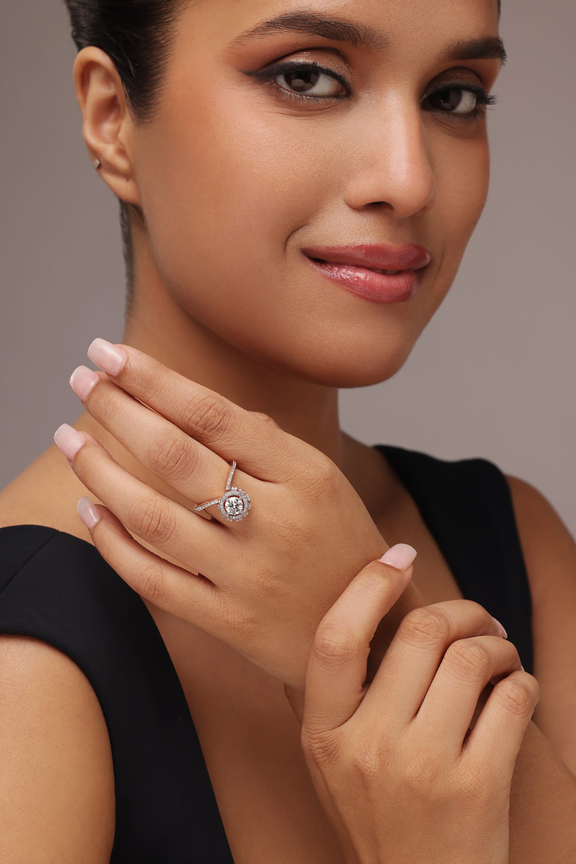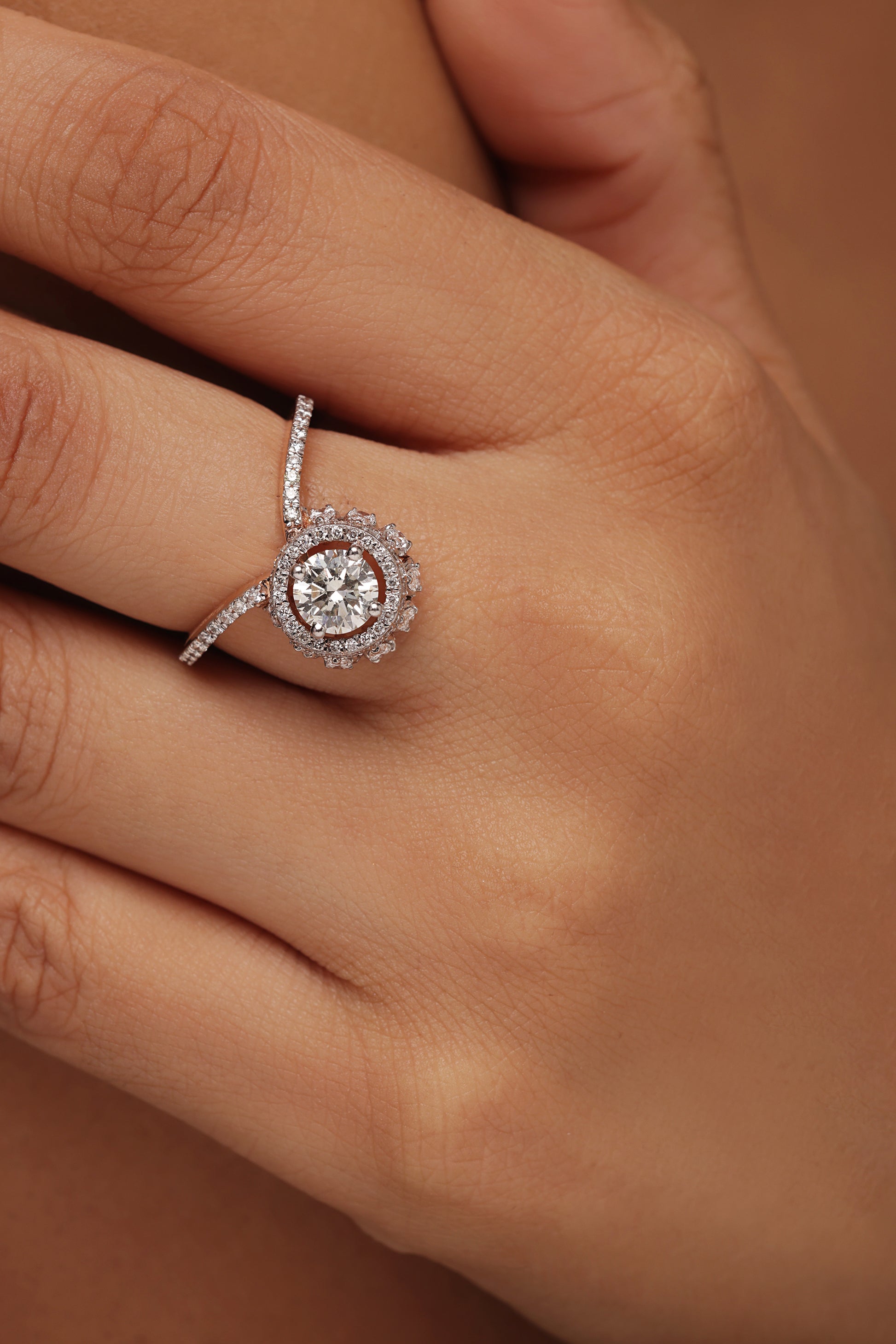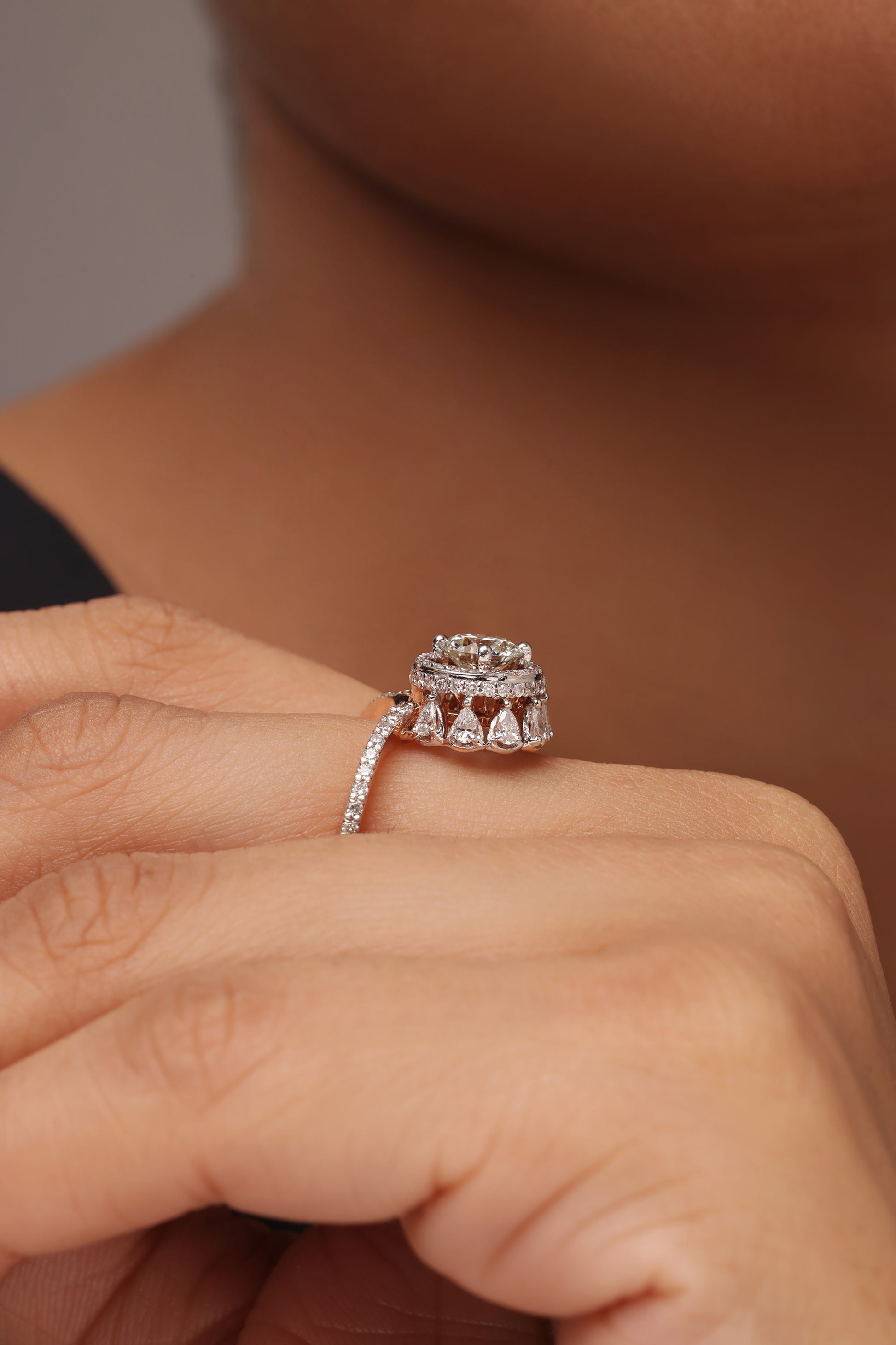 This Diamond Crown Ring with pear-shaped dangles centers around a round brilliant-cut diamond, beautifully framed by a delicate halo of smaller lab grown diamonds that enhance its brilliance. Suspended pear-shaped diamond accents create a graceful crown-like effect, adding movement and visual interest. The slim pavé-set band features a fine line of diamonds, introducing subtle texture while maintaining a light, elegant profile. Precise detailing and balanced proportions lend the design a refined, composed finish, making it a striking yet sophisticated statement piece.