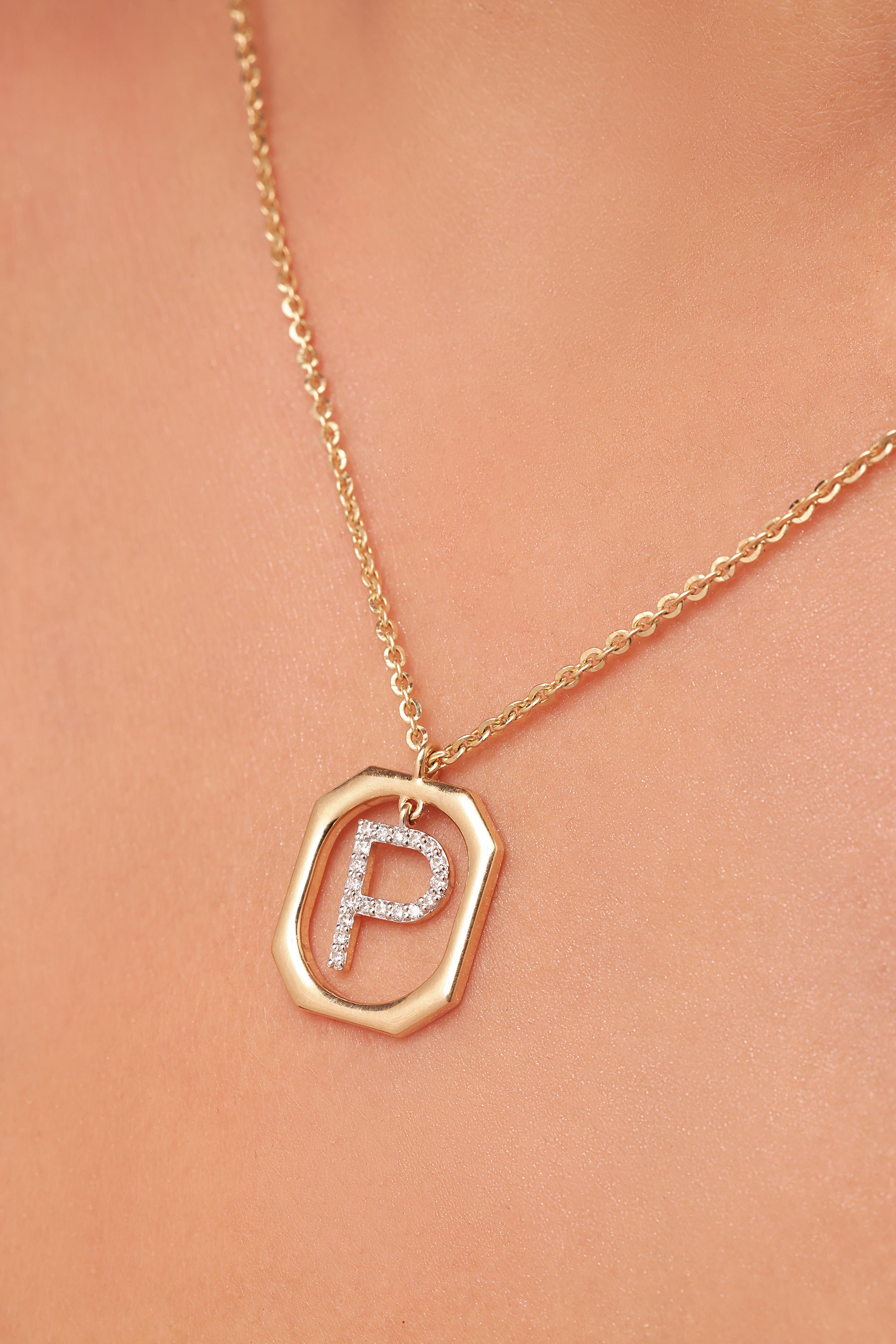 This diamond initial pendant features a sleek octagon frame with a diamond-studded alphabet that sparkles with effortless charm. Crafted in gold, its clean lines and refined details make it the kind of piece you never want to take off. Whether it carries your own initial or the initial of someone who feels like home, this pendant becomes a quiet, meaningful reminder you can wear every day. It’s like a whispered tribute to the one that lives closest to your heart.