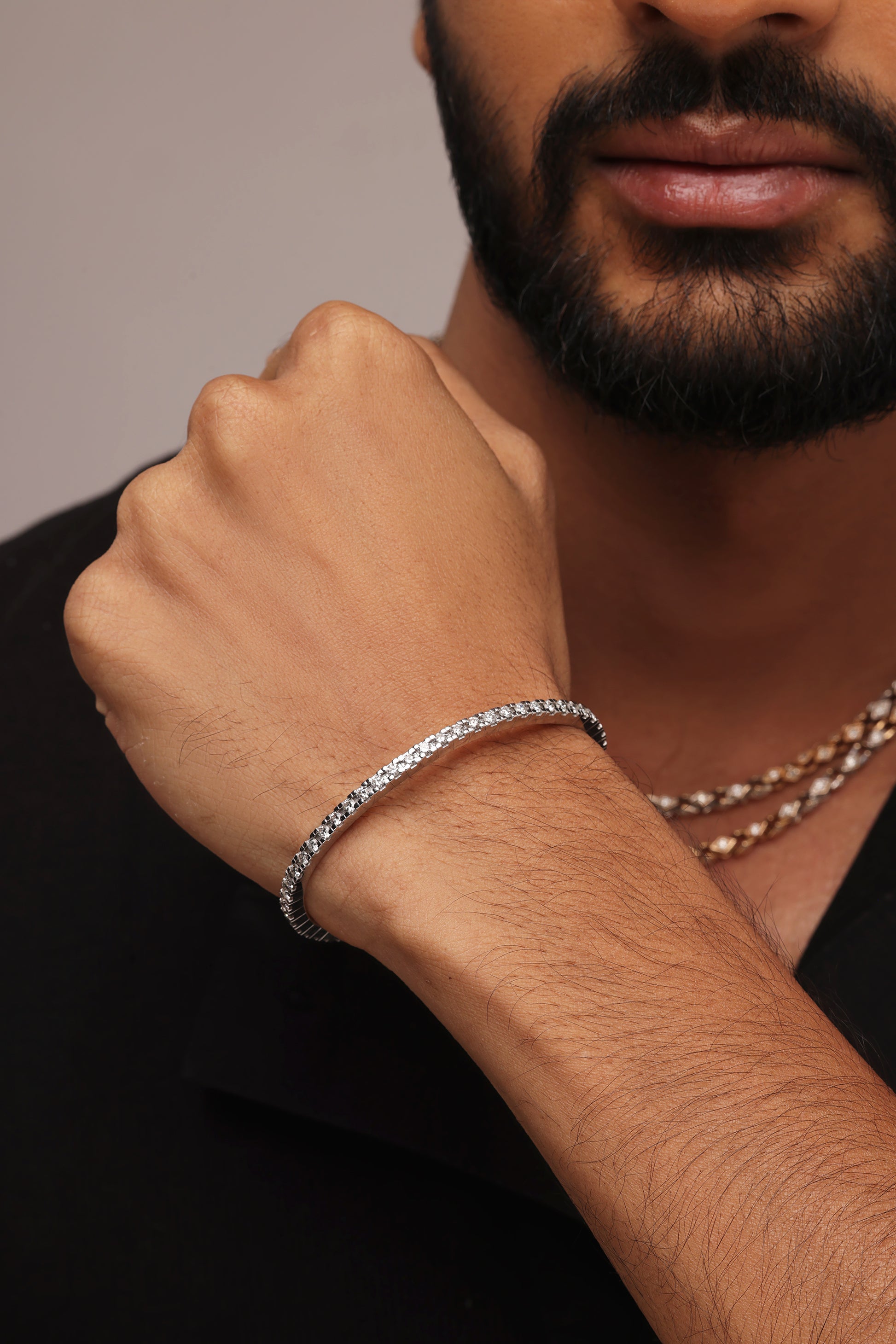 This lab grown diamond bracelet features a continuous line of round brilliant-cut lab diamonds. The design incorporates a flexible, likely elastic or spring-loaded, mechanism that enables it to effortlessly stretch and fit various wrist sizes.