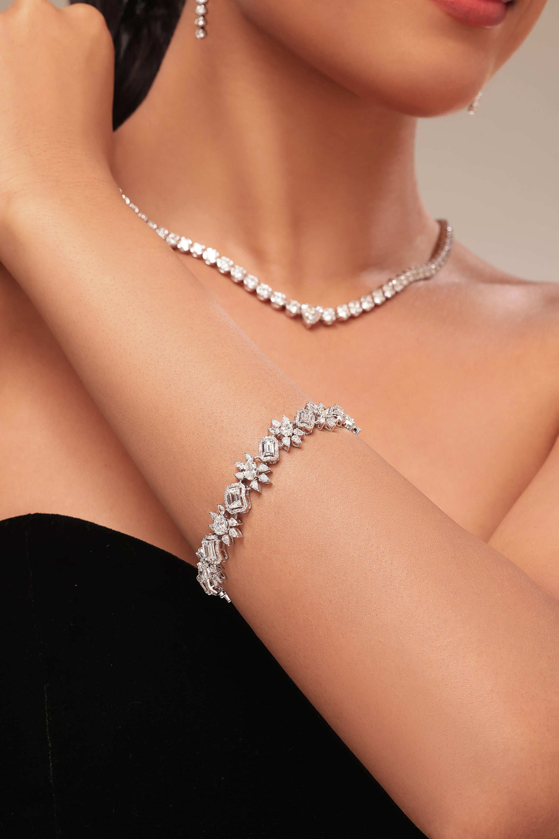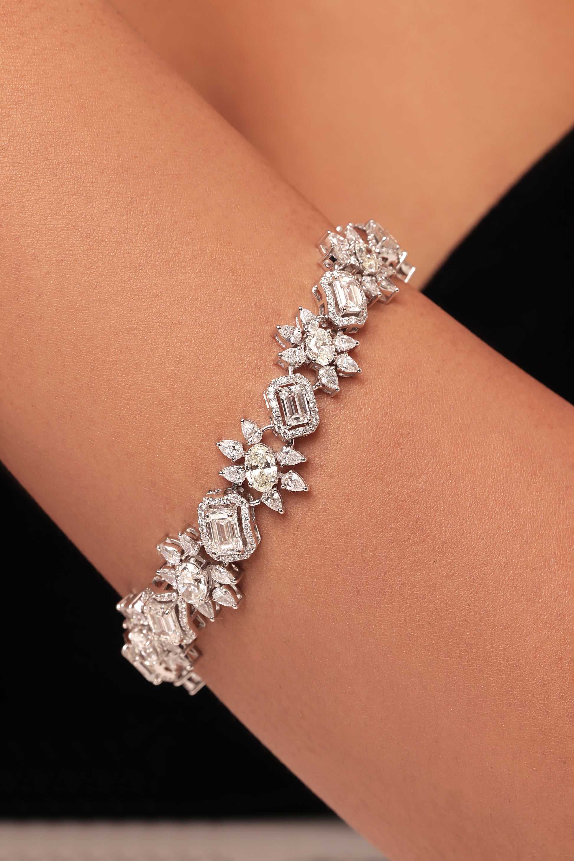 This exquisite bracelet features radiant emerald-cut diamonds as its centerpiece, each framed by a brilliant cluster of marquise and pear-shaped diamonds. Set in a luminous white gold base, the floral-inspired design offers a dazzling display of light and symmetry — perfect for elevating any evening ensemble.