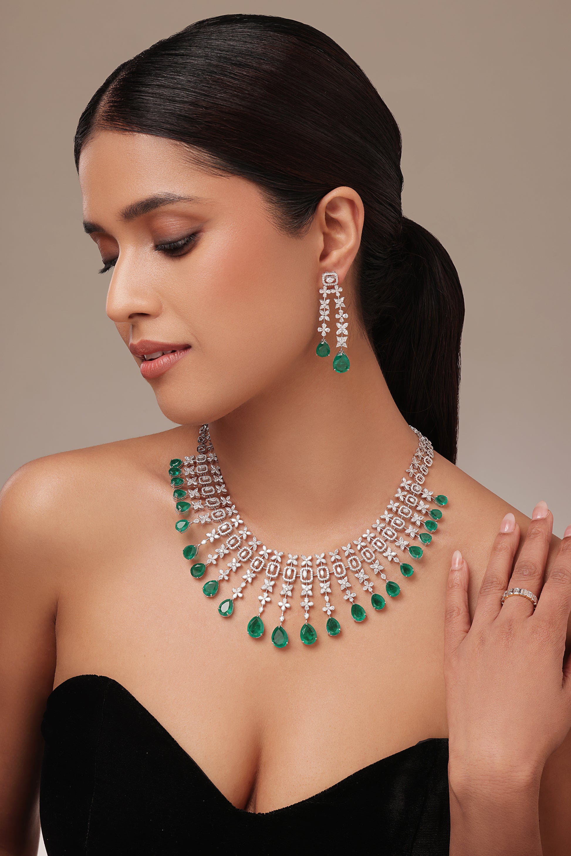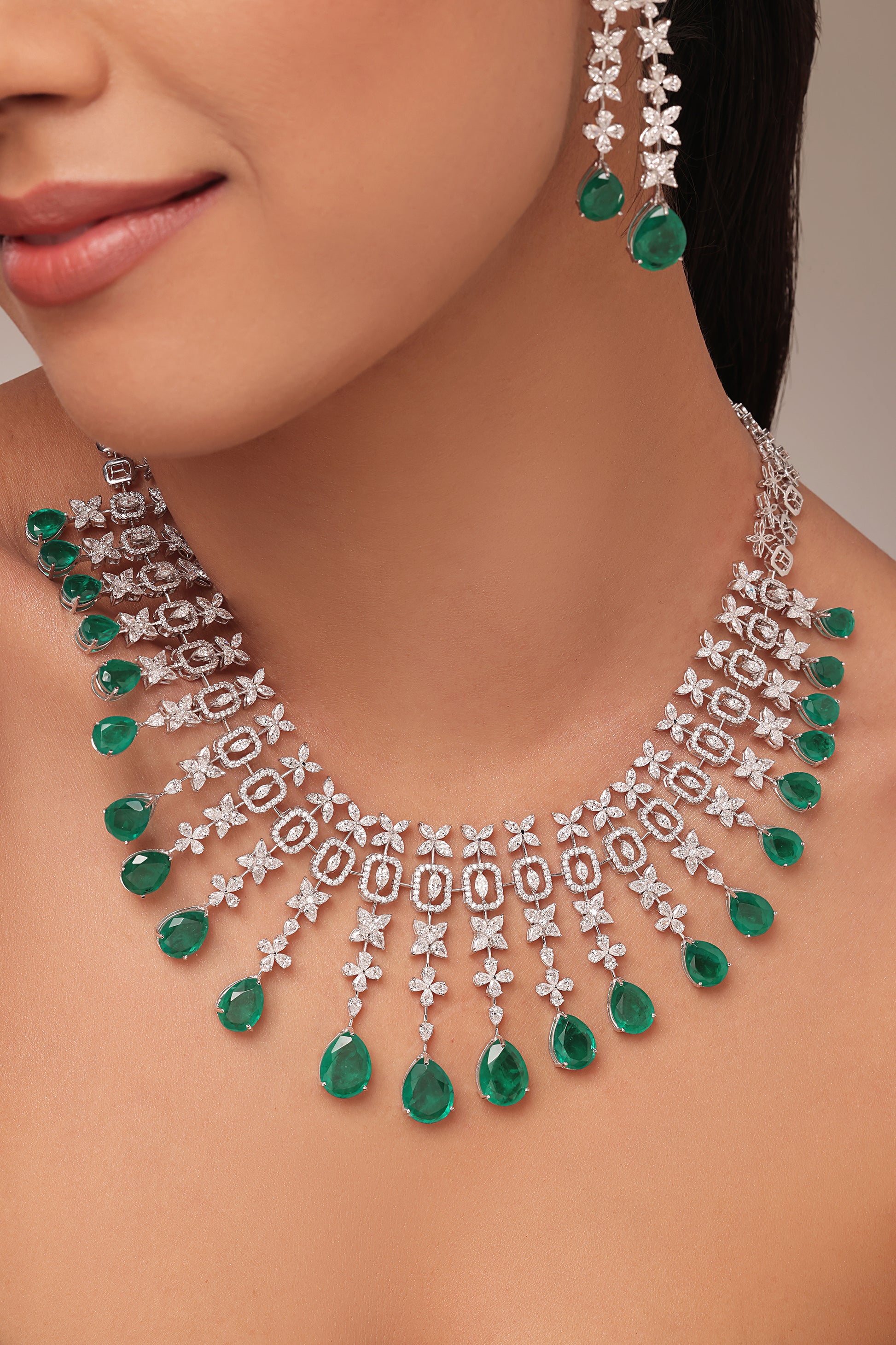 The striking emerald and lab grown diamond choker necklace set is styled with its intricate floral design and pavé-set diamonds, the lab grown diamonds shown appear to be a mix of various cuts, including round brilliant and emerald cuts. The emeralds are cut into a pear shape.