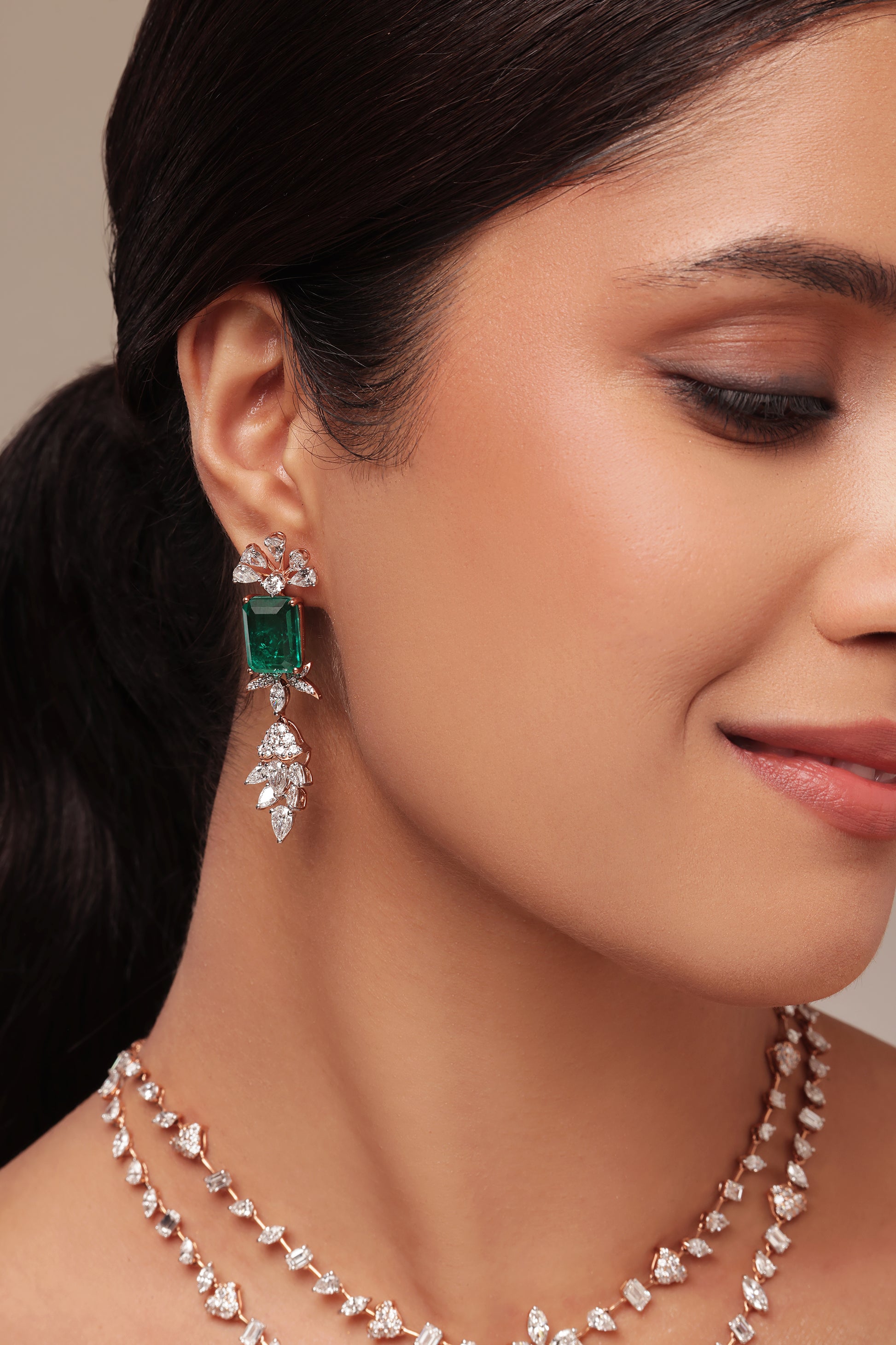 The striking emerald and lab grown diamond layered necklace set is styled to highlight a refined, feminine elegance. With its intricate two-tiered design and pavé-set diamonds. The diamonds shown appear to be a mix of various cuts, including pear-shaped, marquise, and round brilliant cuts.