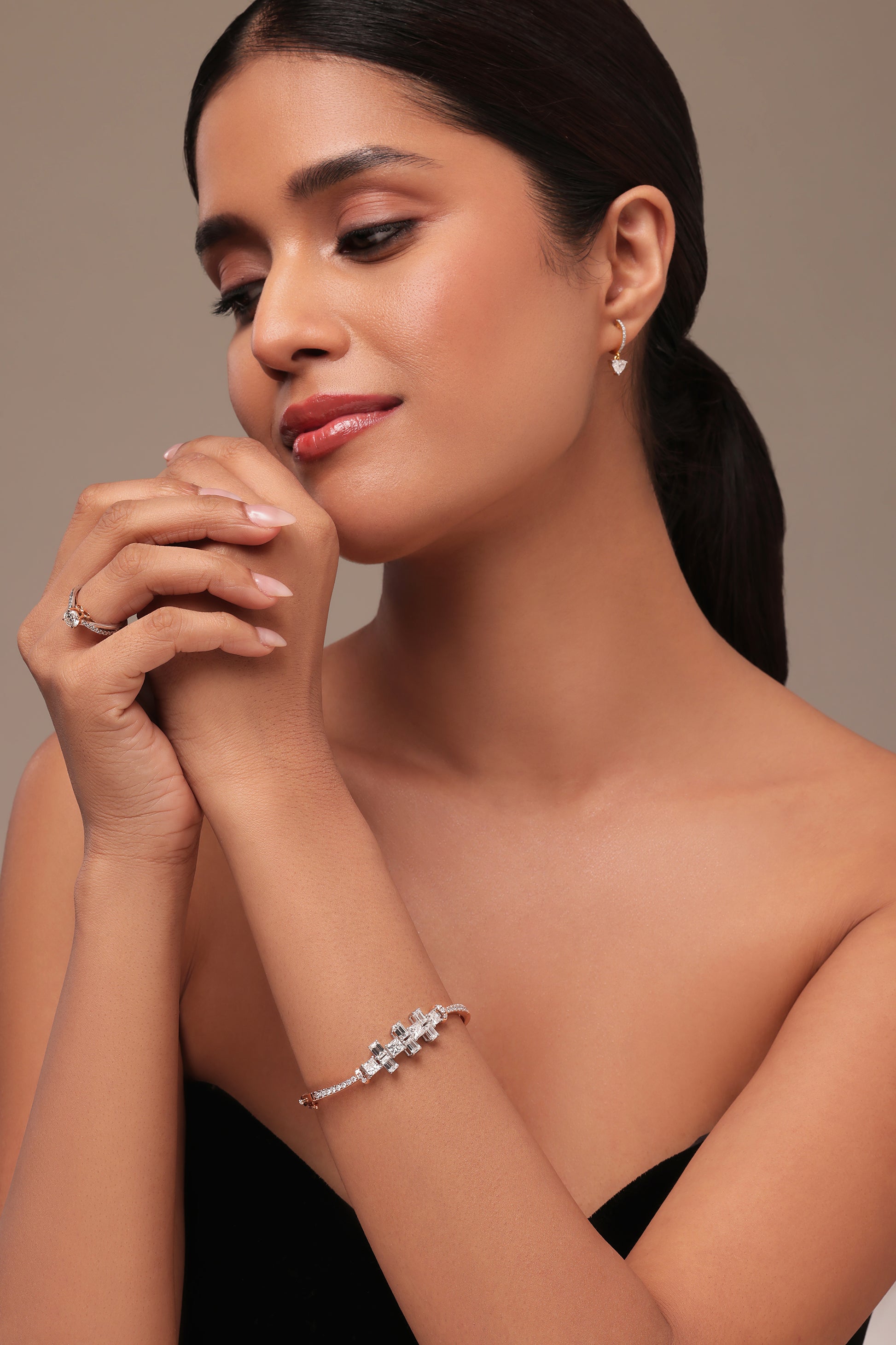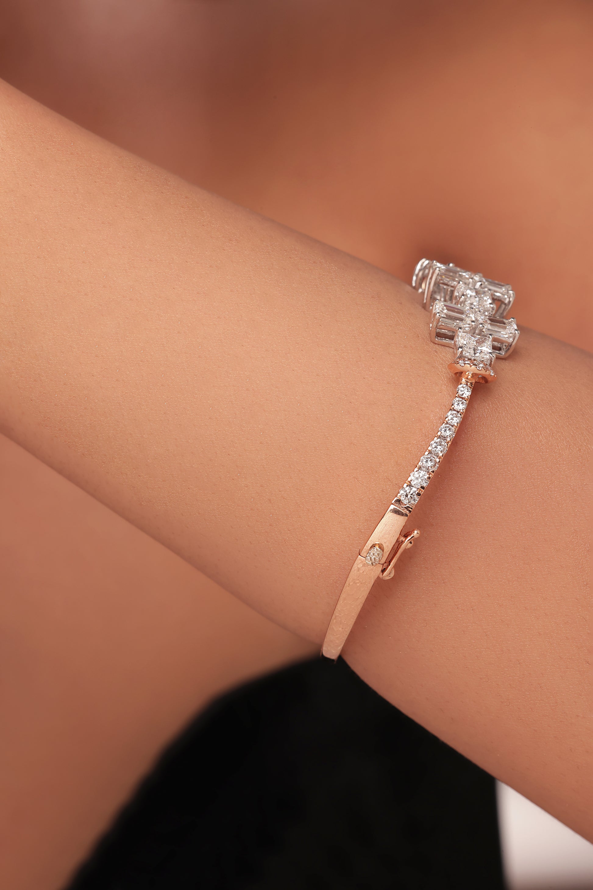 This lab grown diamond bracelet features a central design composed of alternating horizontal bars of emerald cut diamonds and clusters of princess brilliant-cut lan grown diamonds, set in a captivating pattern. These central lab diamond segments are connected to a delicate, pavé-set diamond chain that encircles the wrist.