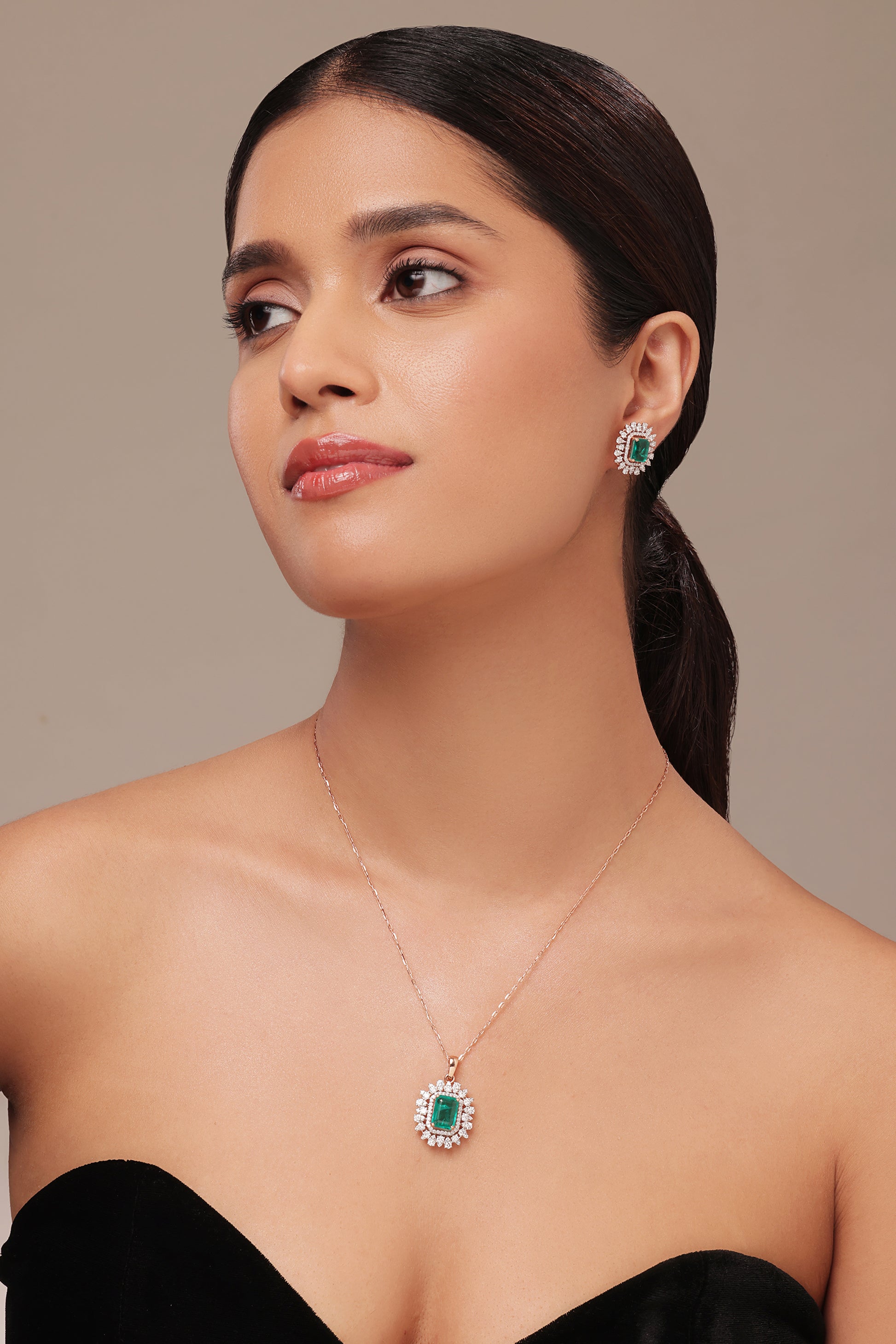 Featuring a bold emerald-cut green lab grown stone at the center, these statement earrings offer a rich and luxurious look. Surrounding it is a halo of sparkling lab-grown diamonds arranged like petals, adding brilliant shine from every angle. The design feels graceful, perfect for that refined and classic look. Comfortable to wear and beautifully eye-catching, these studs bring a touch of royalty to every outfit.