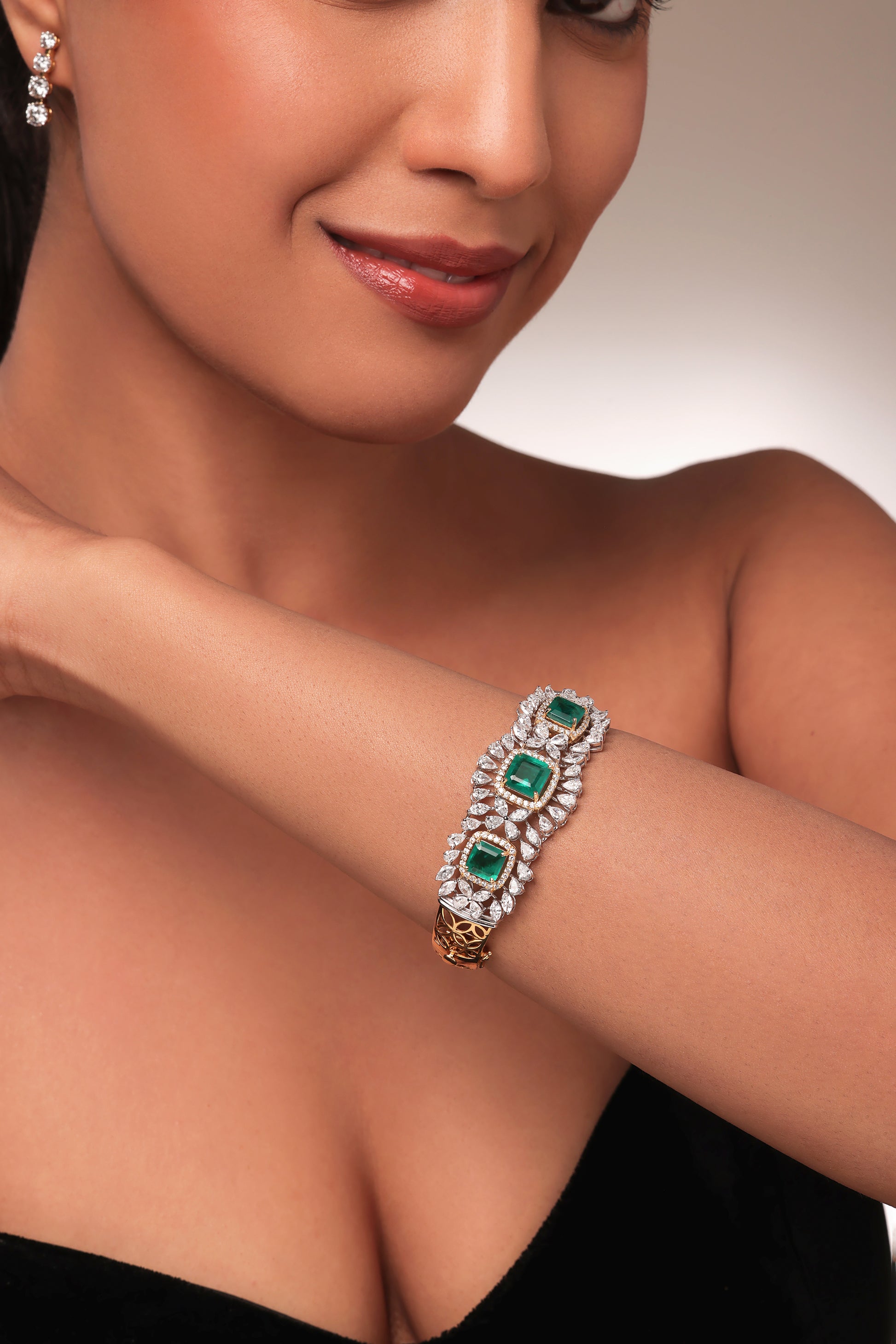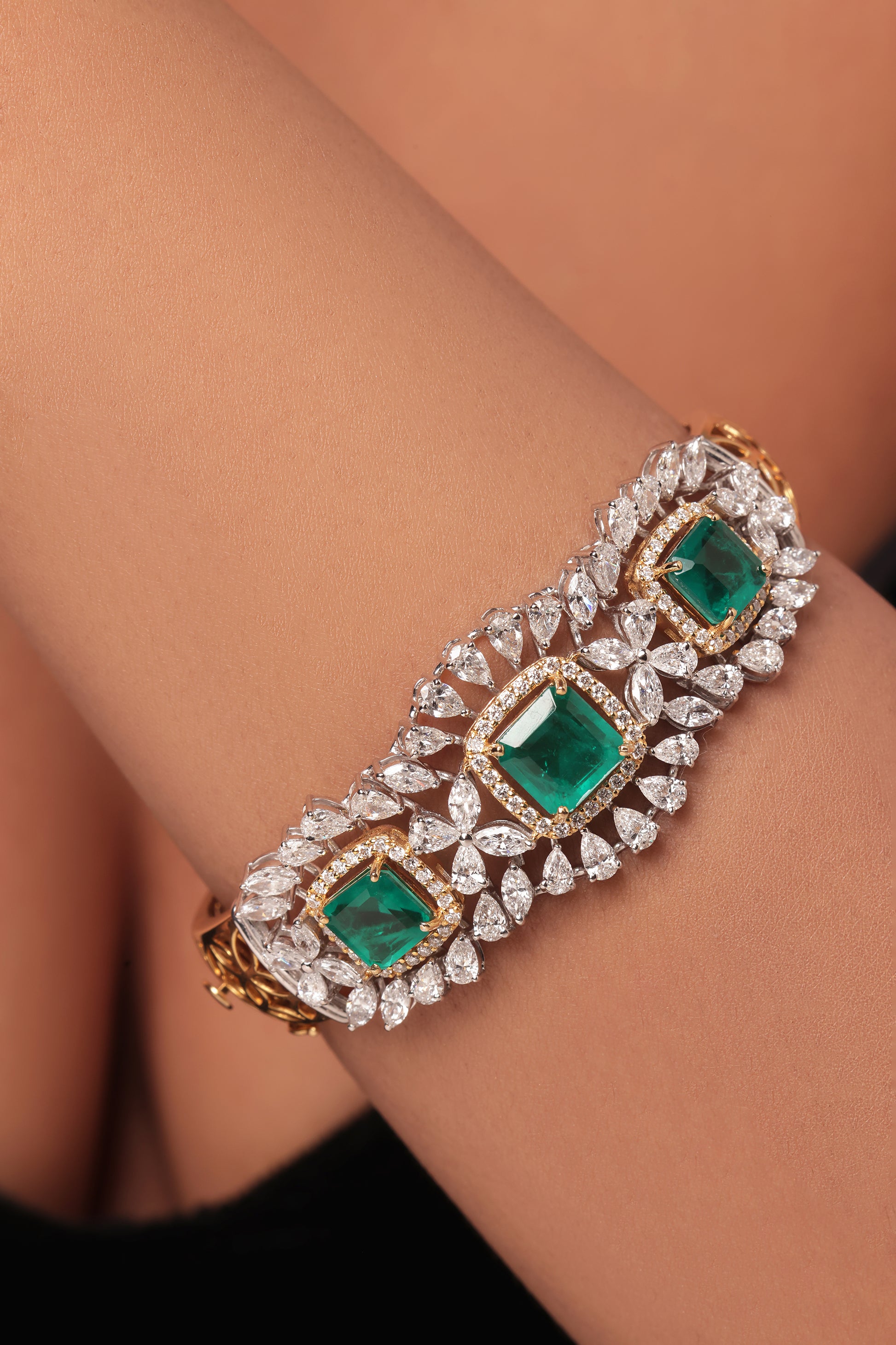This exquisite lab grown diamond oval bangle features a striking design with three prominent square-cut green emeralds serving as the focal points. Each emerald is meticulously framed by a halo of smaller lab grown diamonds, and further accentuated by radiant clusters of pear and marquise shaped lab diamonds.