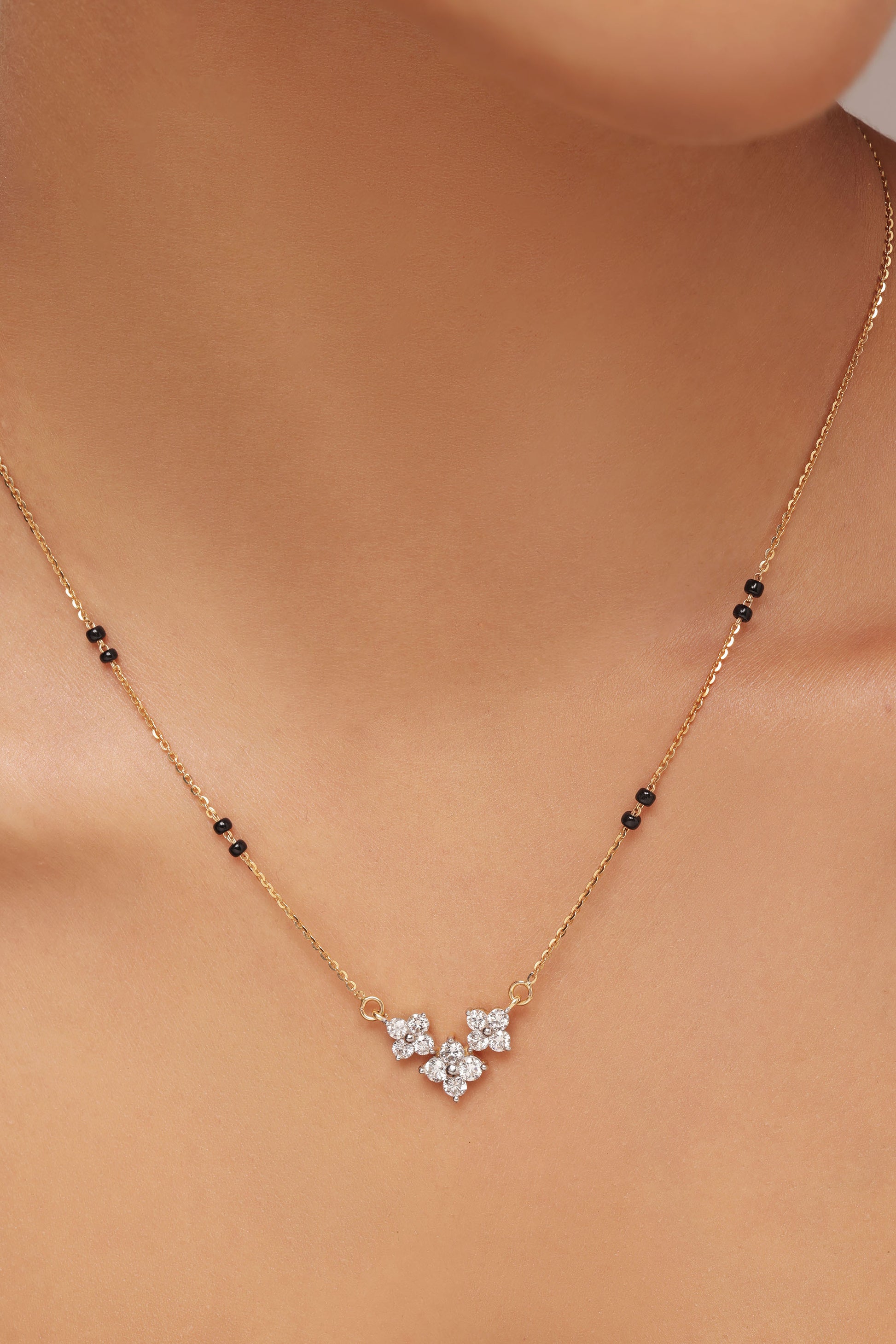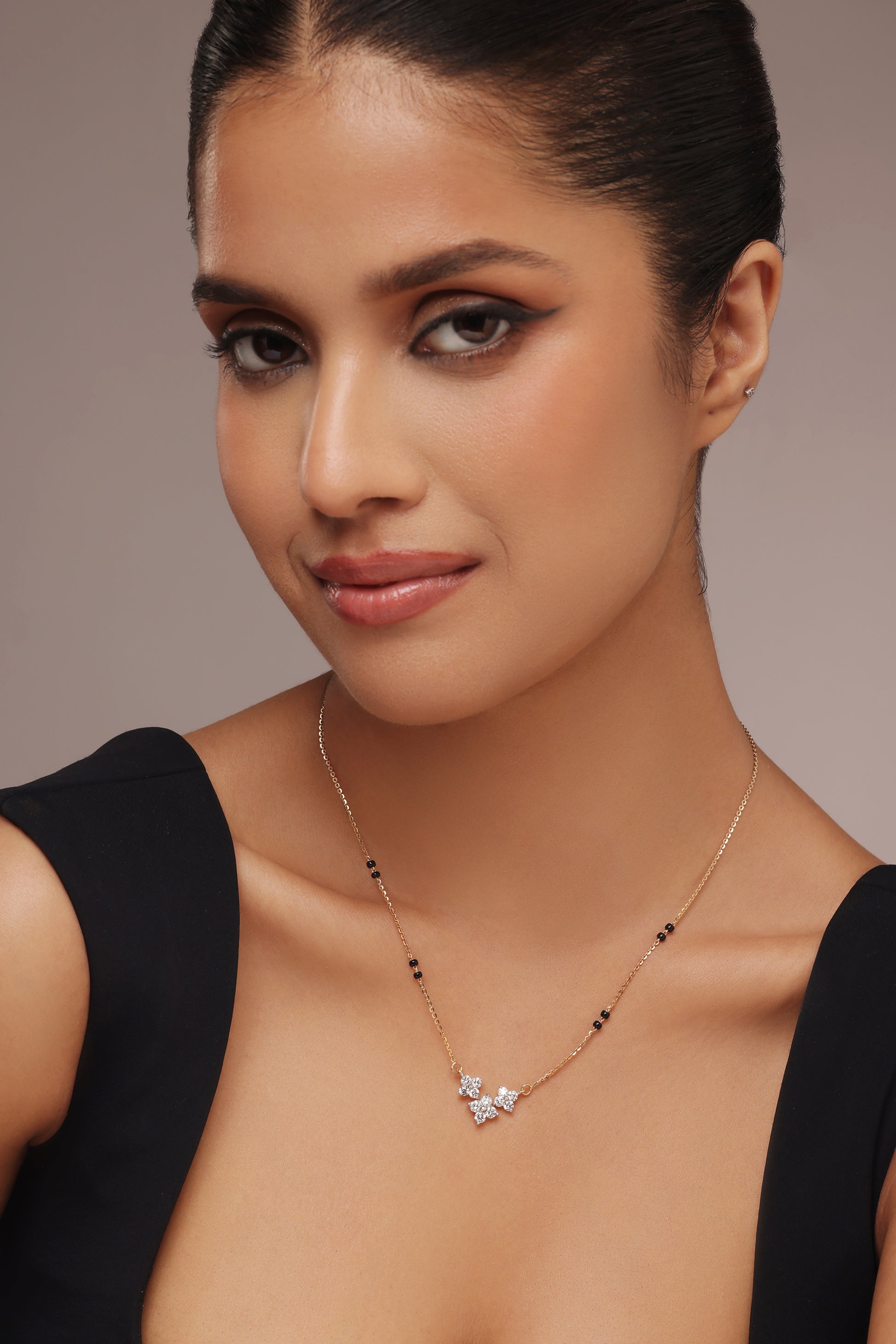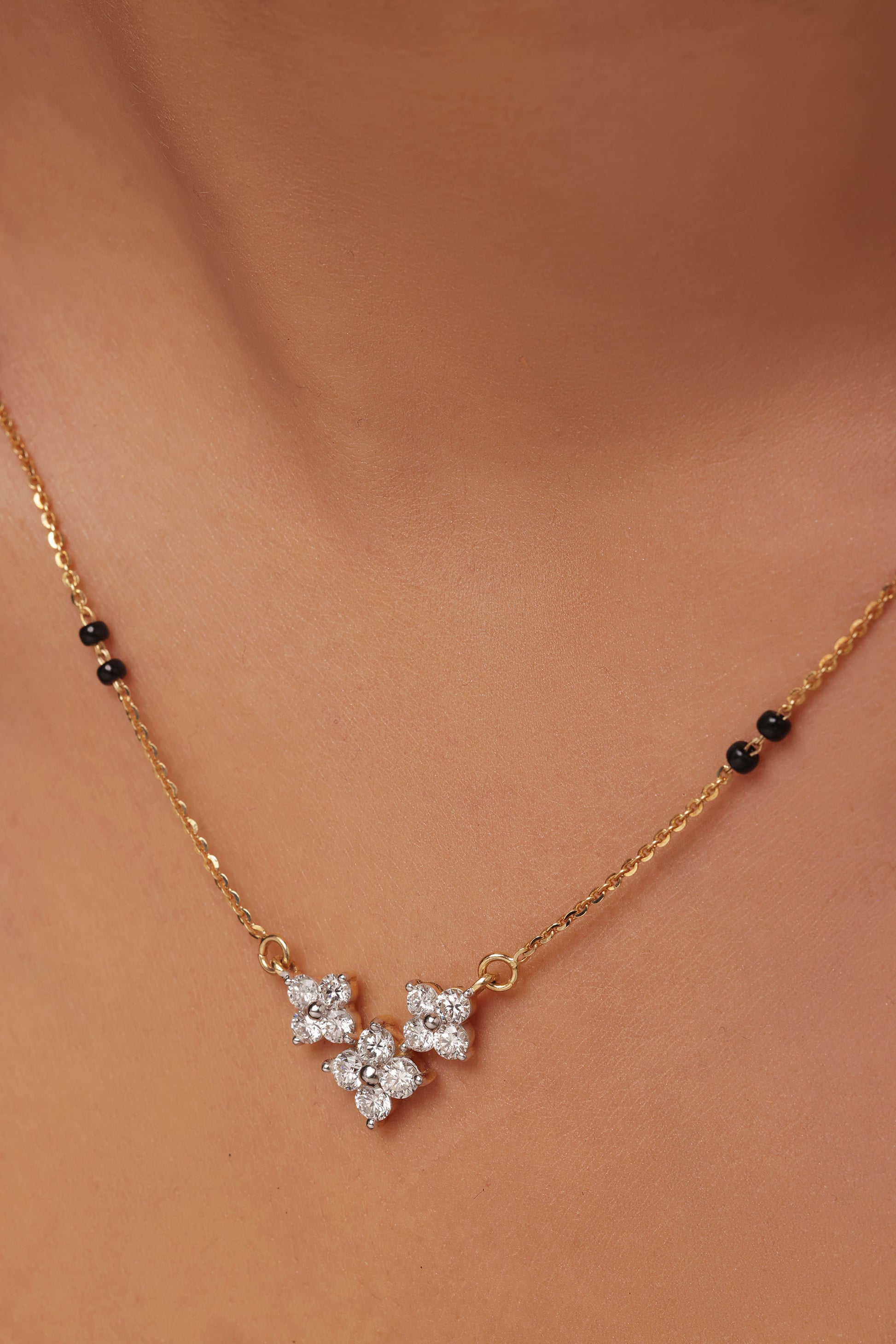 This Mangalsutra features a delicate gold chain with traditional black beads. The central pendant comprises three distinct floral clusters, each formed by multiple brilliant round lab grown diamonds meticulously set together to create the shape of a flower.