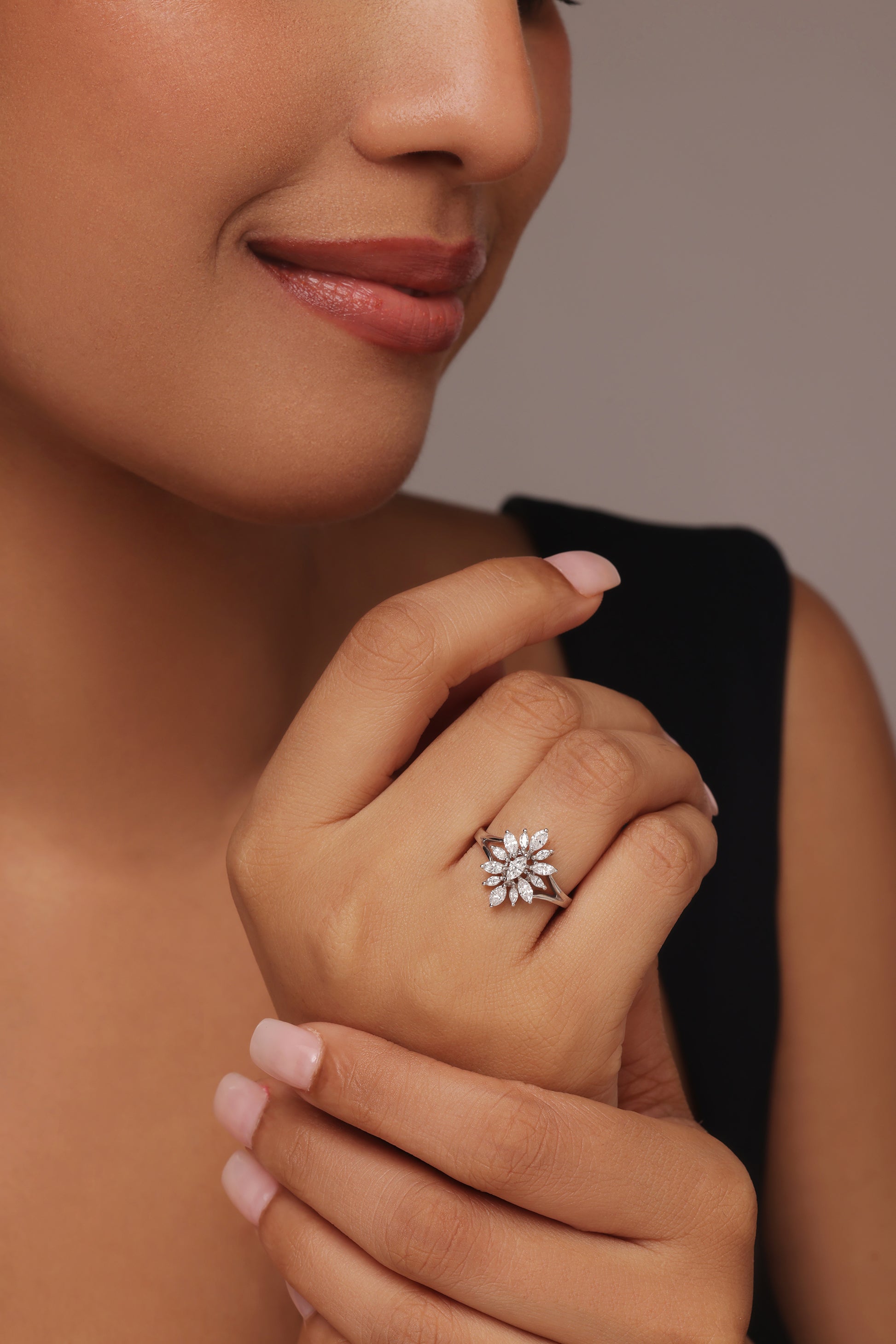 This lab grown diamond ring features a central cluster designed to resemble a blooming flower. It is composed entirely of multiple brilliant lab grown marquise-cut diamonds, meticulously arranged with their points facing outwards to create petal-like formations.