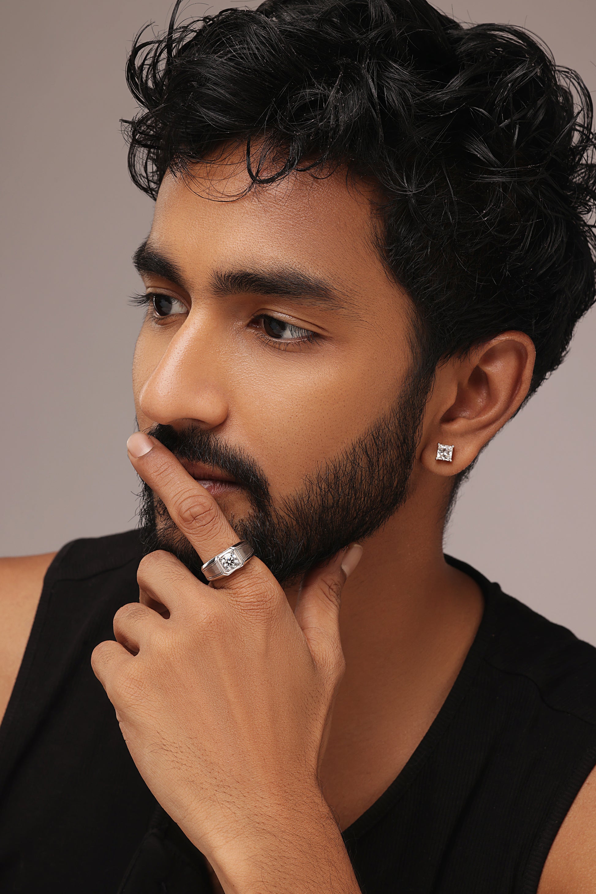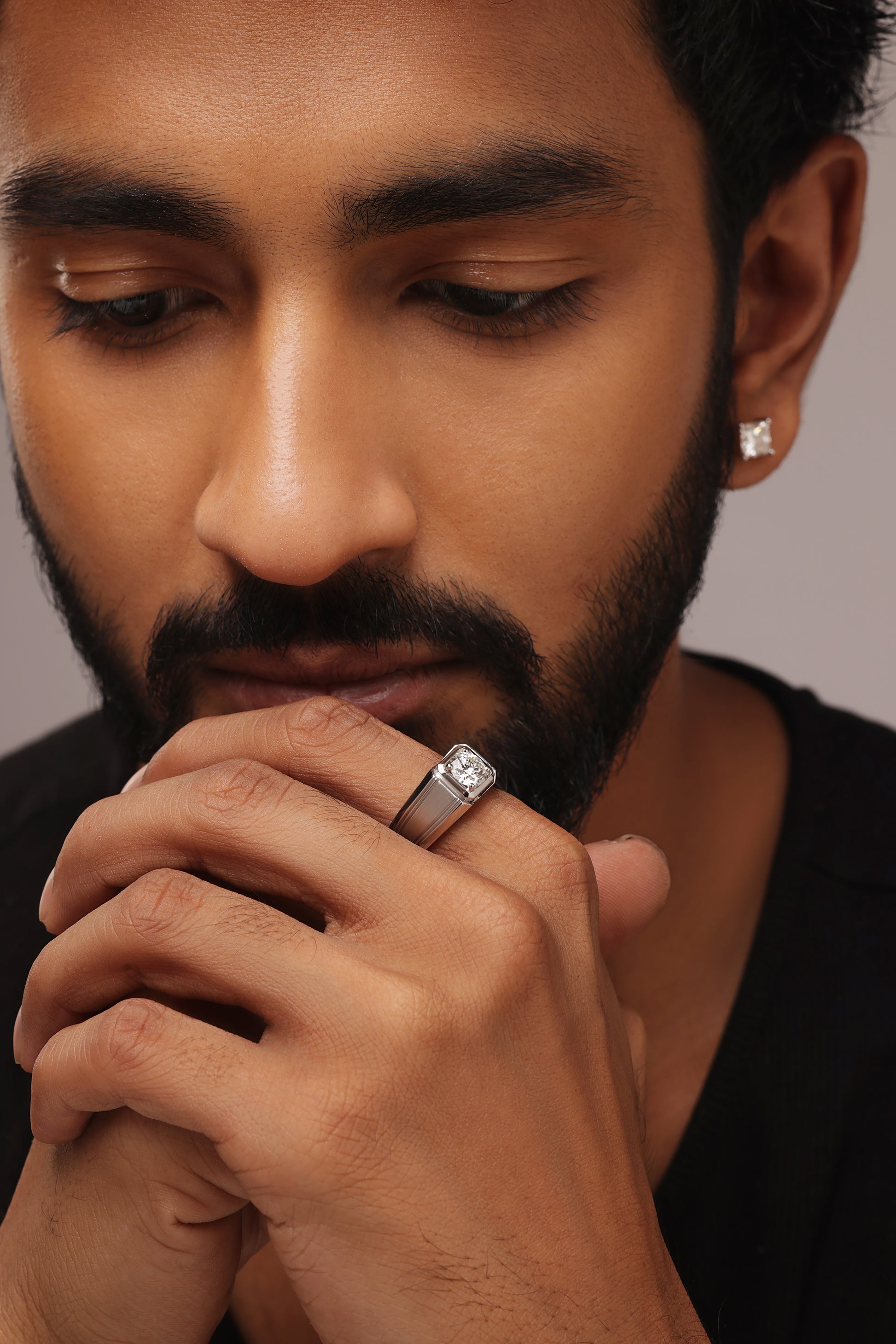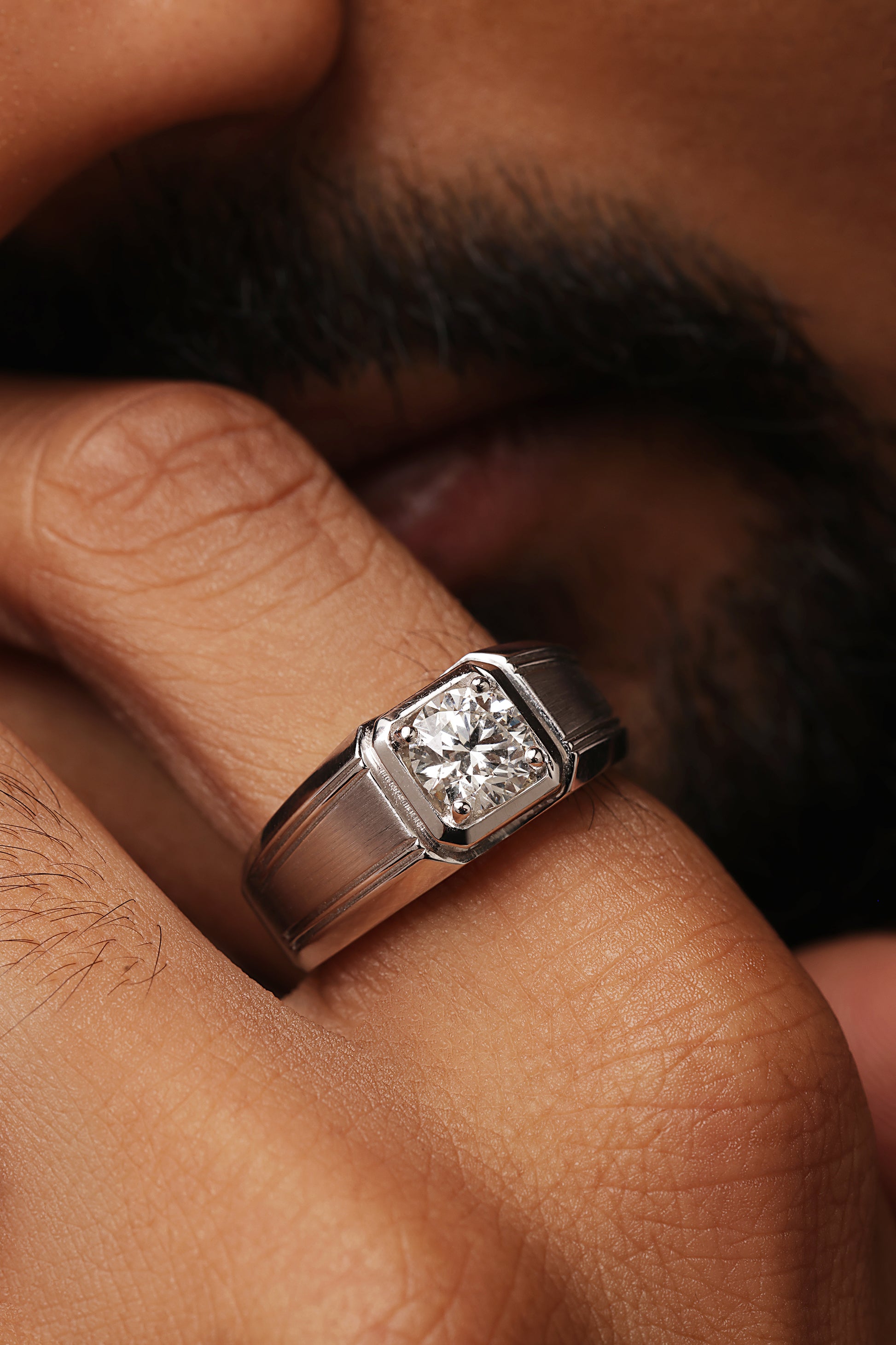 This simple and elegant men's ring features a single, round brilliant diamond as its centerpiece. The diamond is set in a secure bezel setting, which is integrated smoothly into the band.