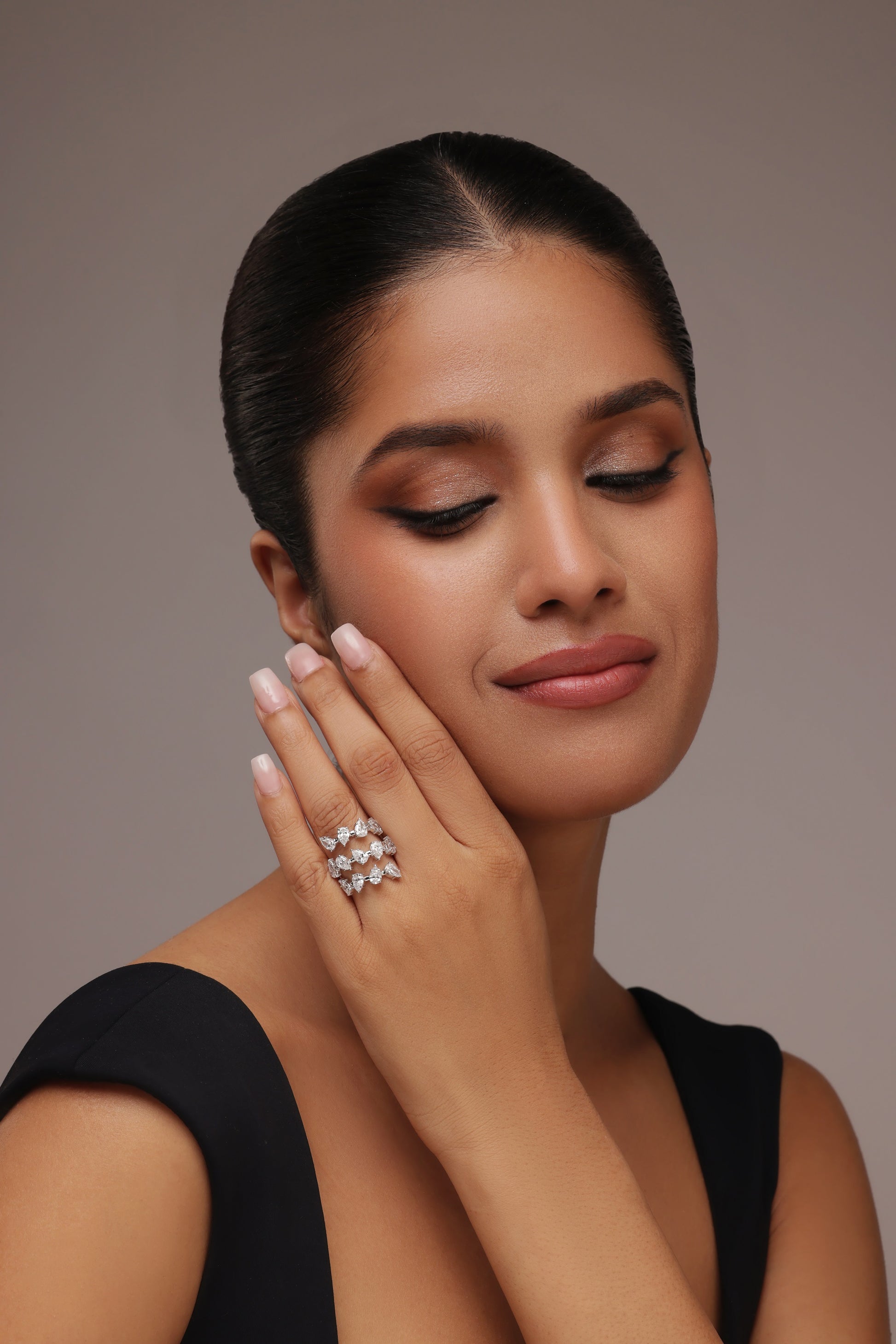 This Multi-Layer Pear Diamond Statement Ring features three parallel rows of pear- and emerald-cut diamonds arranged in a structured, open design. Each stone is individually set, creating a sense of rhythm and spacing while allowing light to pass through the form. The layered construction lends the ring a bold, sculptural presence, balanced by precise detailing and a clean, architectural finish. Striking yet refined, this design is perfect for elevating your look with modern sophistication.