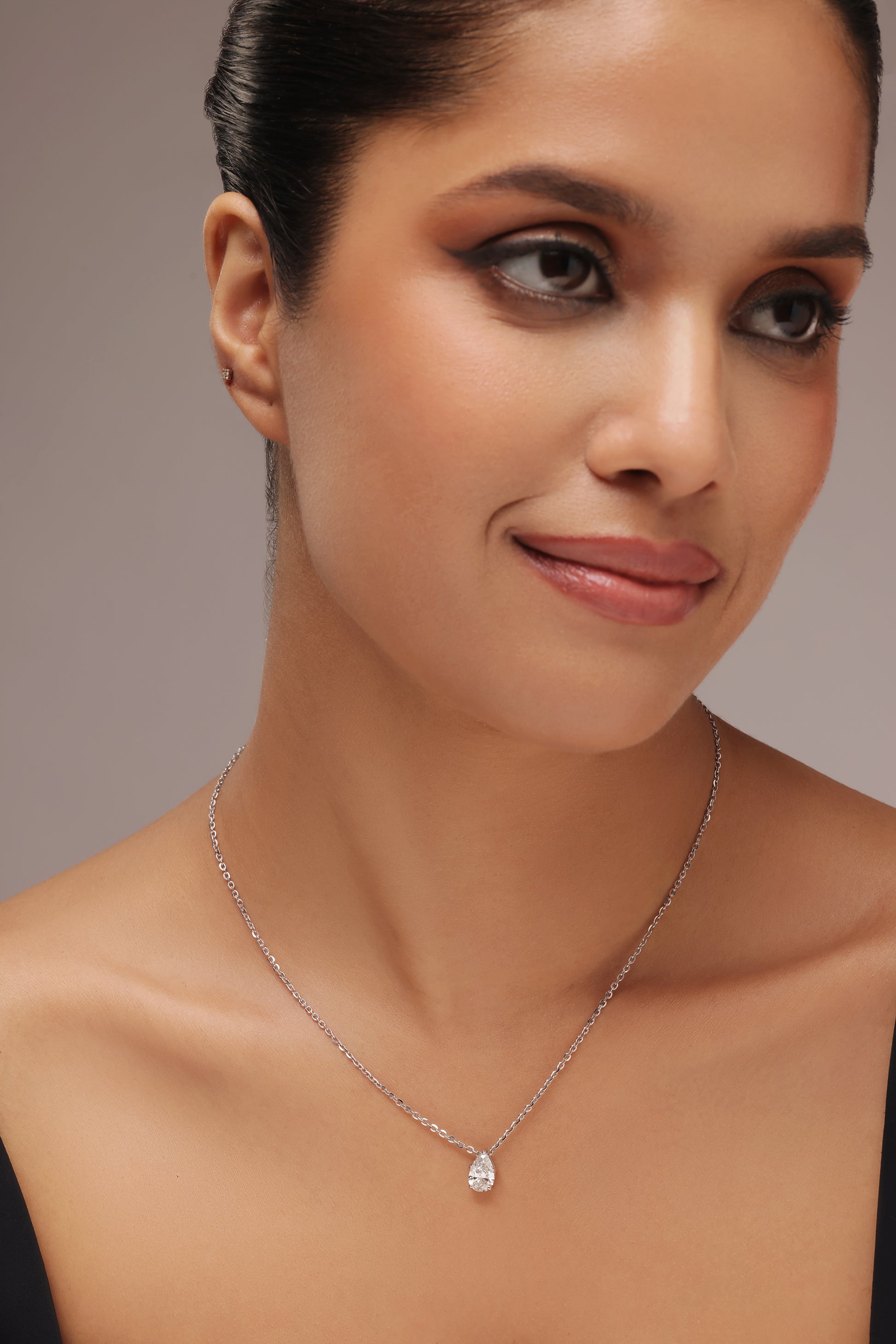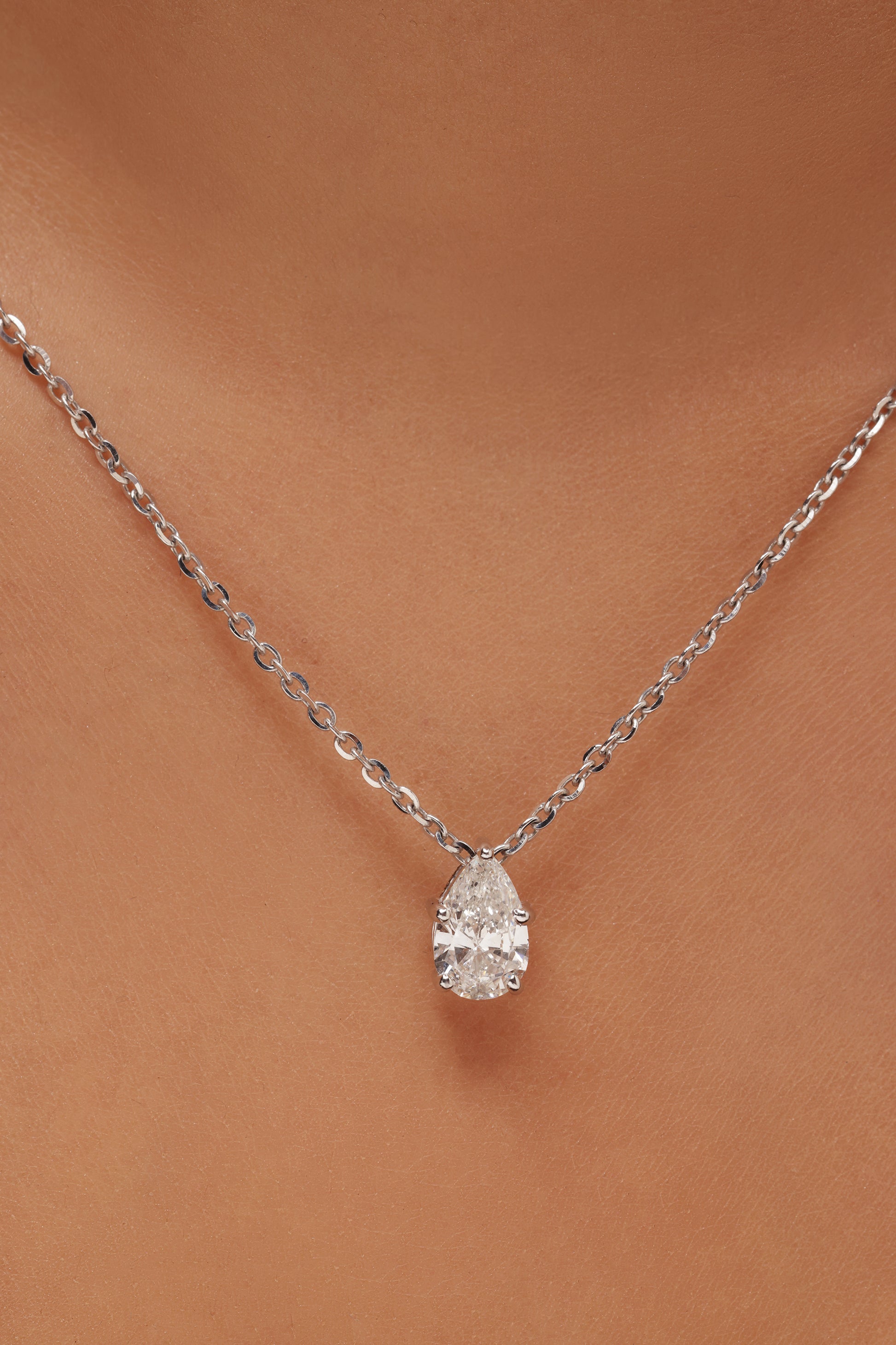A gold pendant featuring a single, brilliant pear-cut lab grown diamond. The teardrop-shaped diamond is held in a classic prong setting.