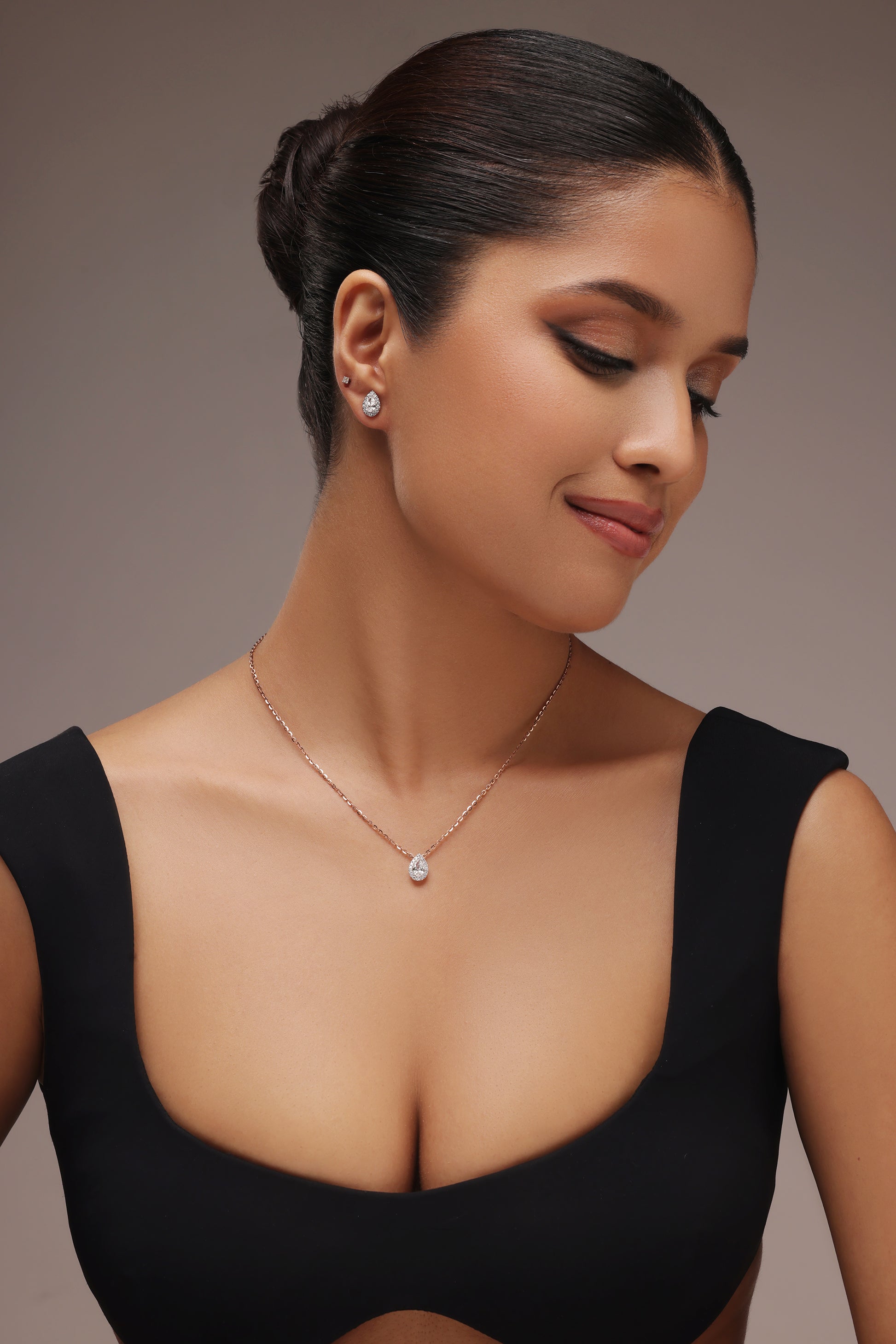 A matching gold set featuring a pendant and stud earrings. Each piece showcases a pear-cut diamond surrounded by a sparkling halo of smaller lab grown diamonds.