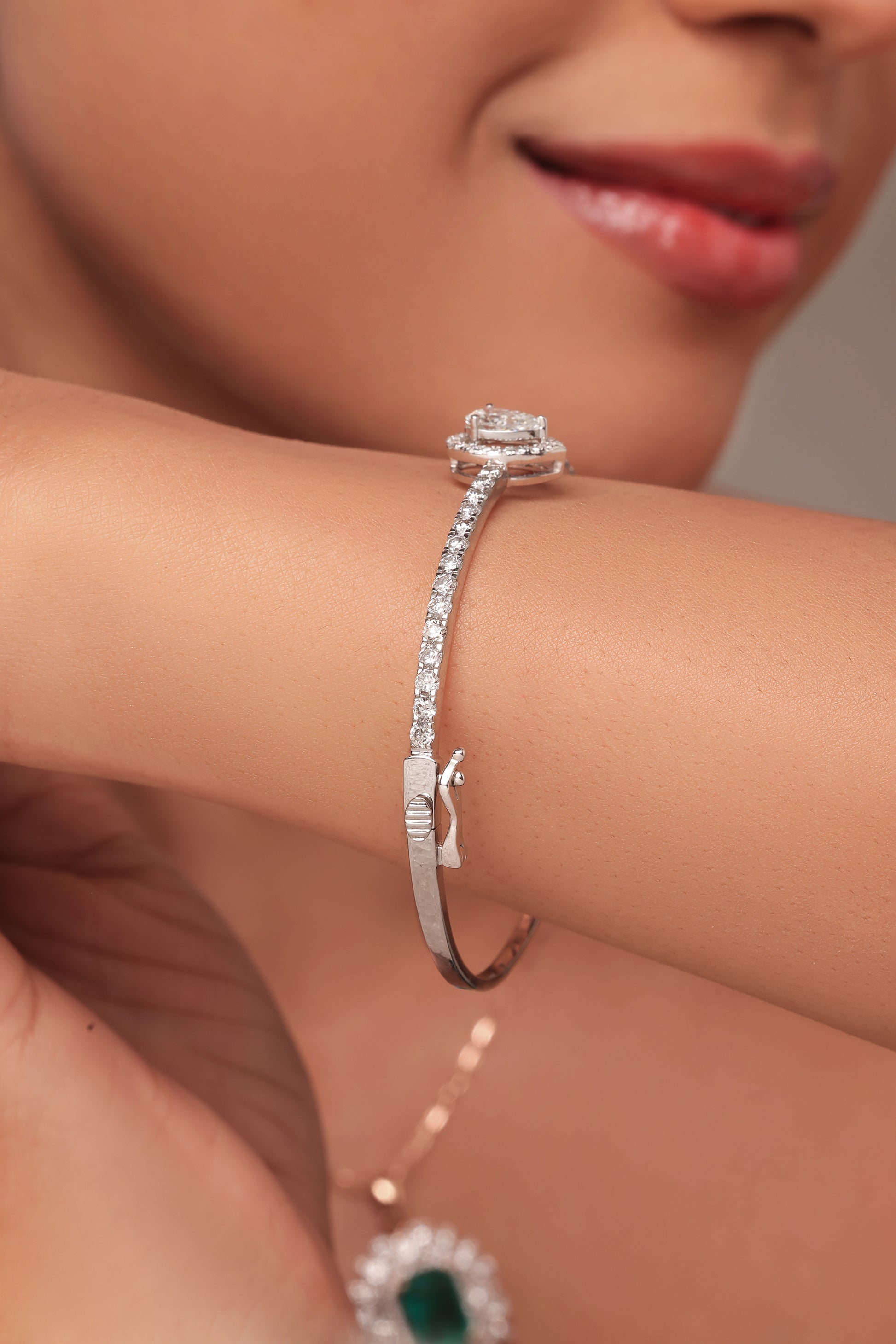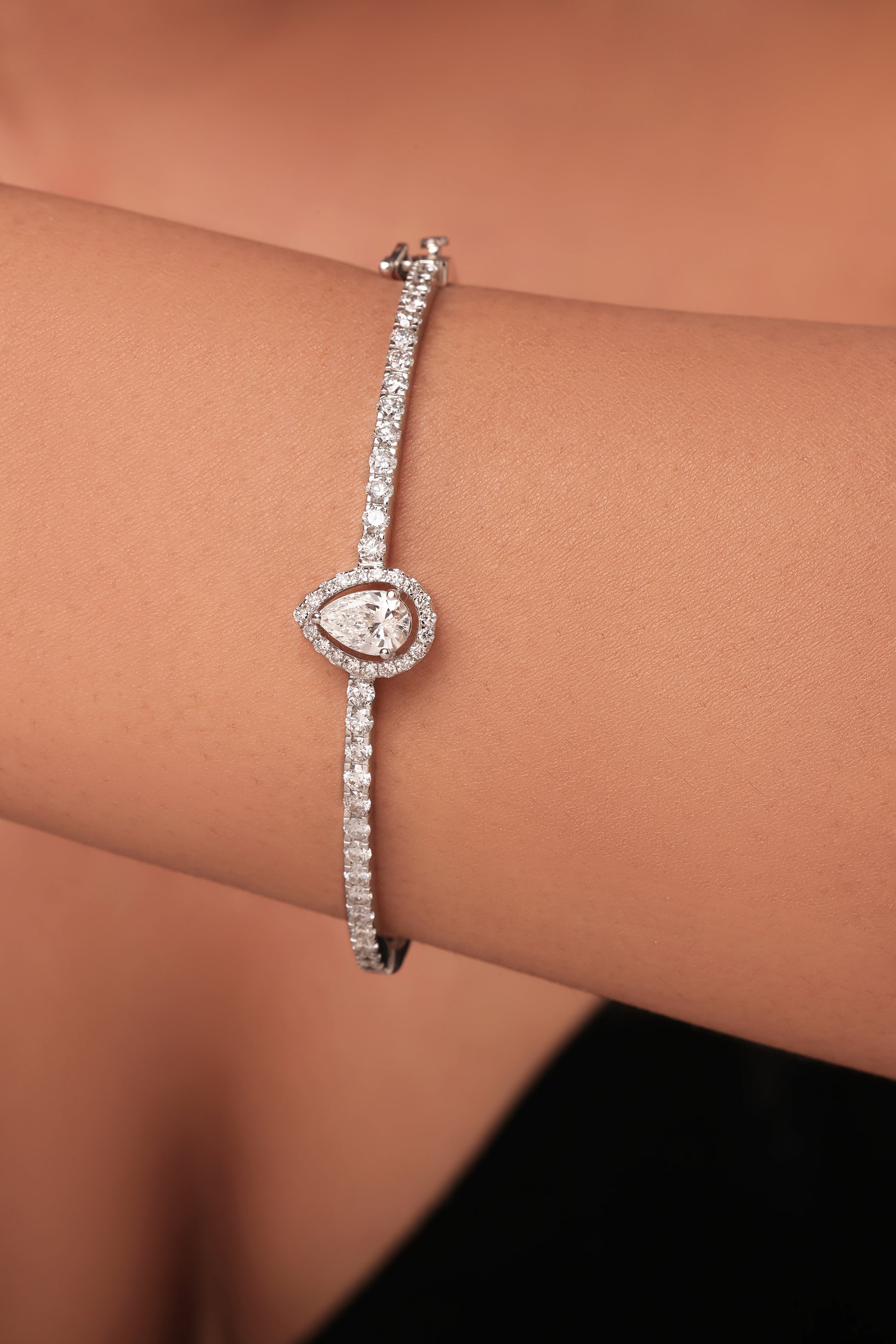 This elegant lag grown diamond oval bracelet features a striking central design: a brilliant pear-shaped diamond meticulously set and surrounded by a sparkling halo setting of smaller, round lab grown diamonds. The slender yet substantial band of the bangle is entirely adorned with pavé-set diamonds.