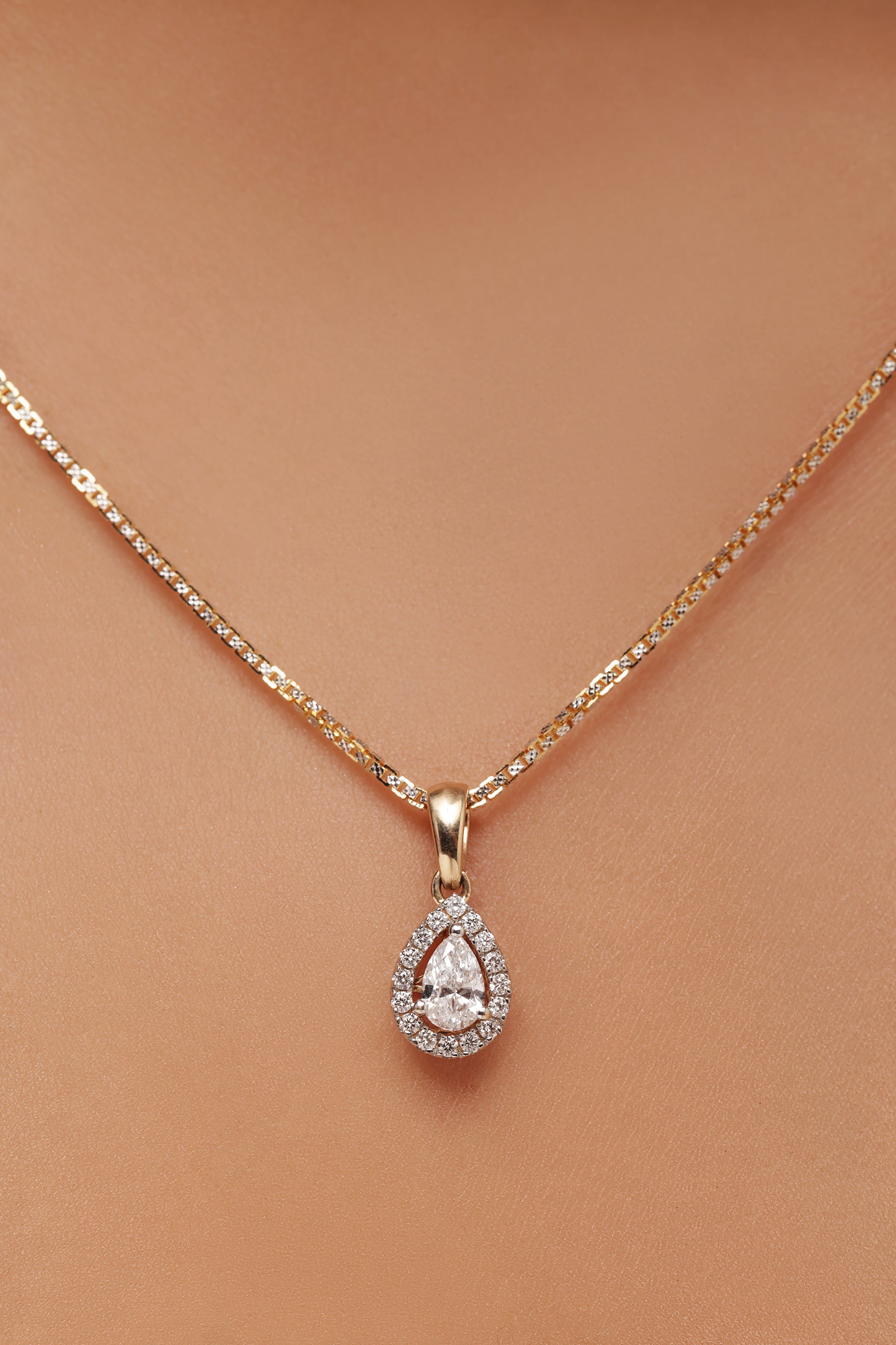 A gold pendant featuring a brilliant pear-cut lab grown diamond, securely set at the center of a sparkling halo made of smaller, round diamonds. The delicate pendant hangs from a fine gold chain.