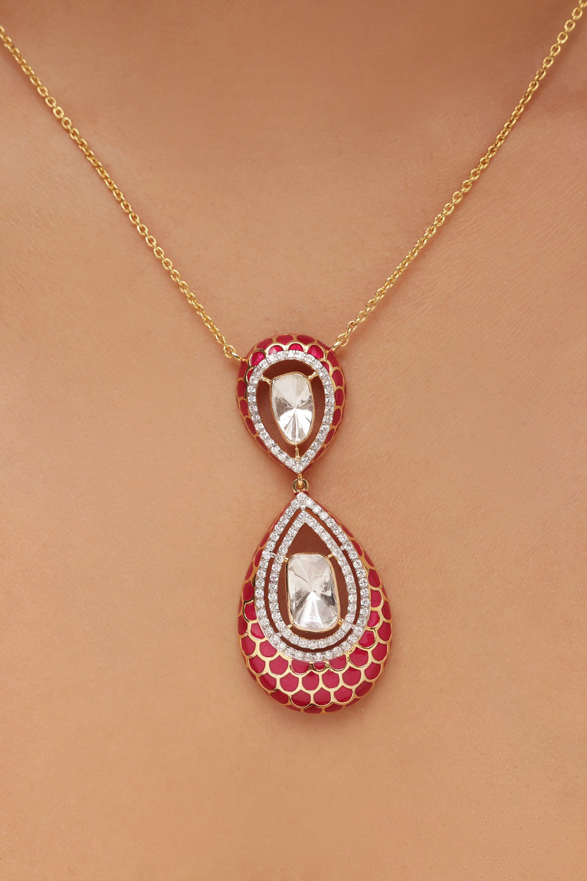 A gold pendant with a two-tiered teardrop-shaped pendant. Each drop features a central polki lab grown diamond framed by brilliant round lab grown diamonds and a vibrant red enamel pattern.