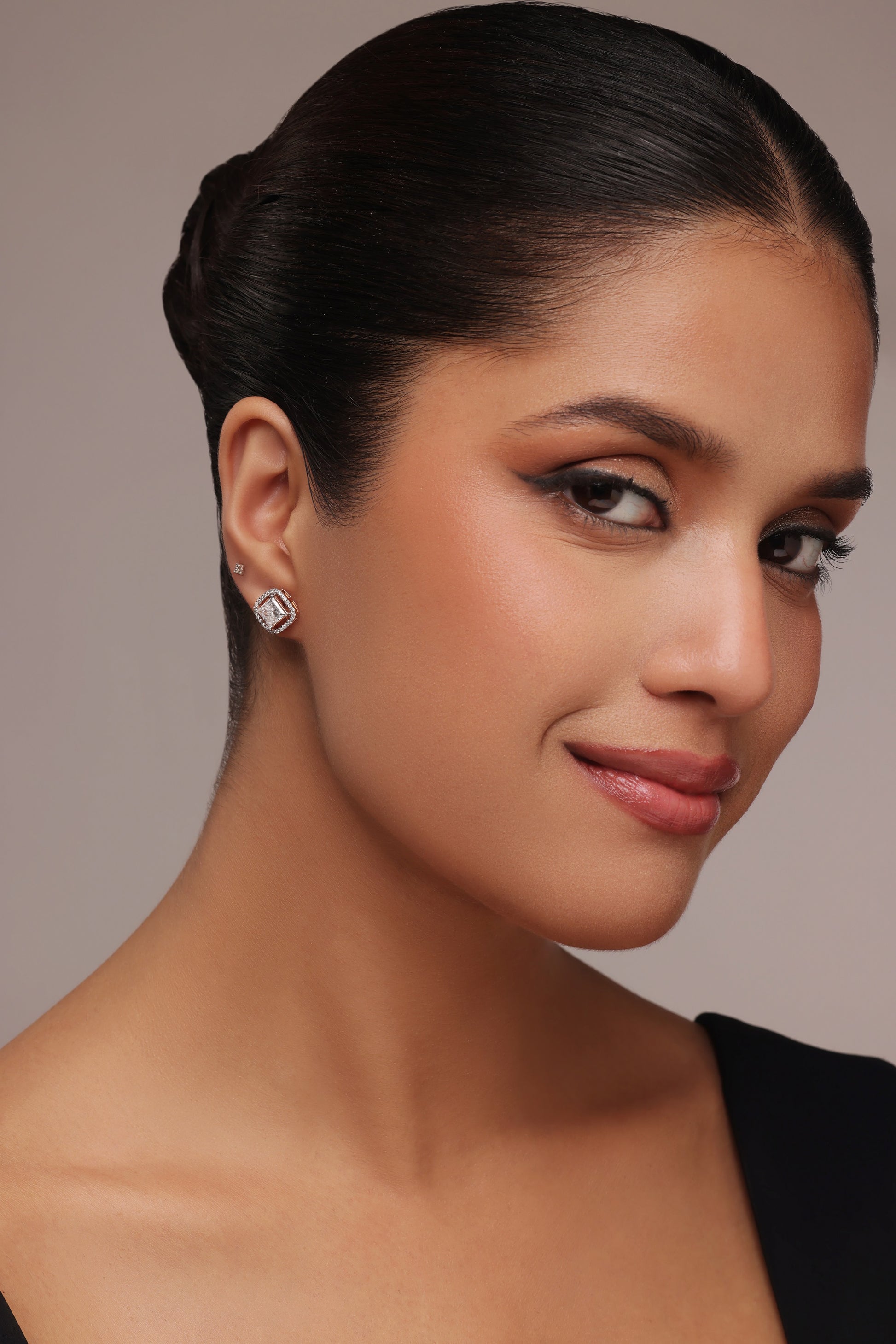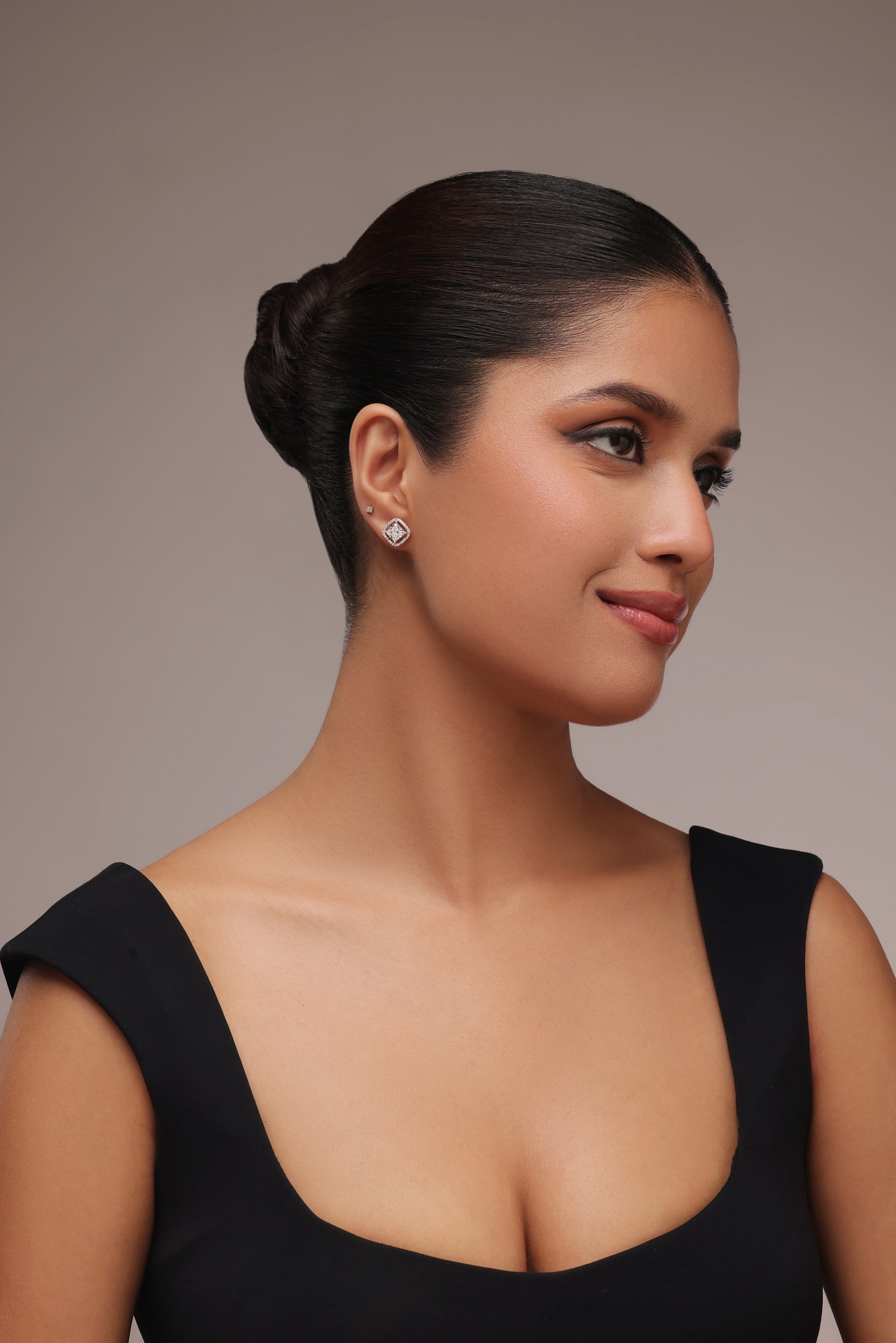 This stunning pair of stud earrings features a brilliant princess-cut lab-grown diamond at its center, surrounded by a sparkling halo of smaller round diamonds. The unique square design with a sleek, open frame gives these earrings a modern and sophisticated look, perfect for adding a touch of glamour to any outfit.