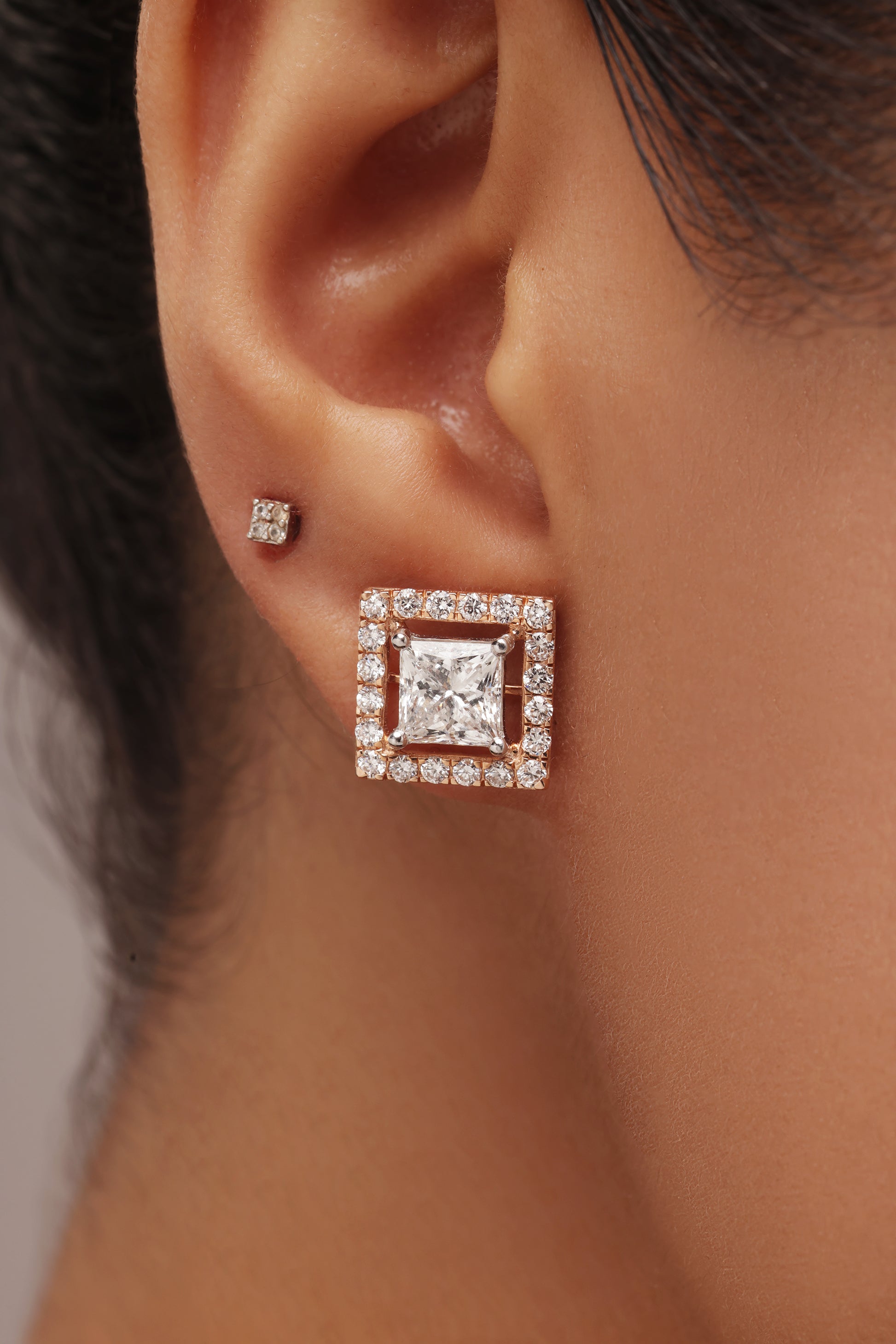 A matching gold set featuring a pendant and stud earrings. Each piece showcases a princess cut design with a brilliant central lab grown diamond surrounded by a sparkling halo.