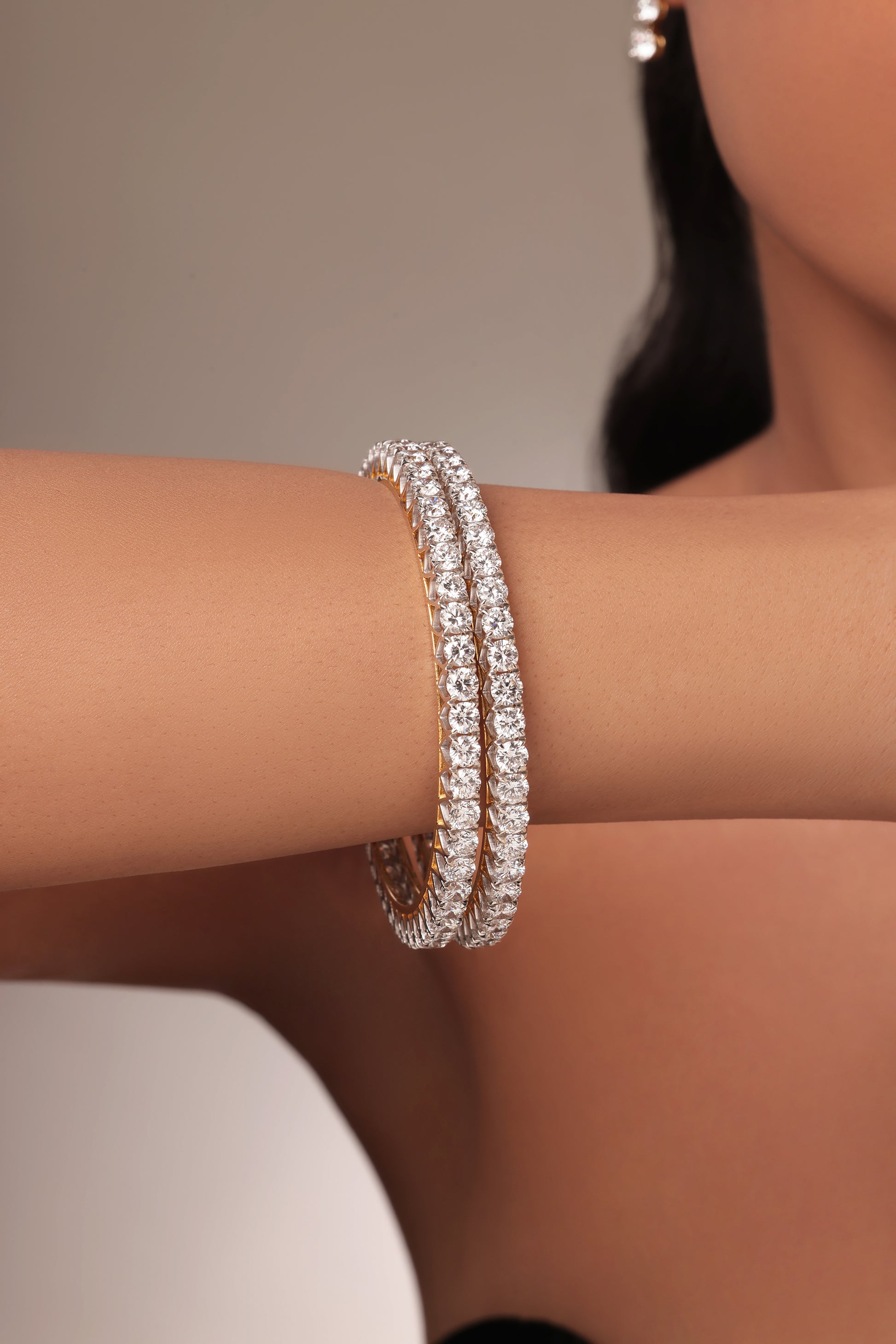 An elegant lab grown diamond bangle showcasing a full circle of brilliant-cut lab diamonds. The stones are meticulously set side-by-side on a polished gold band.