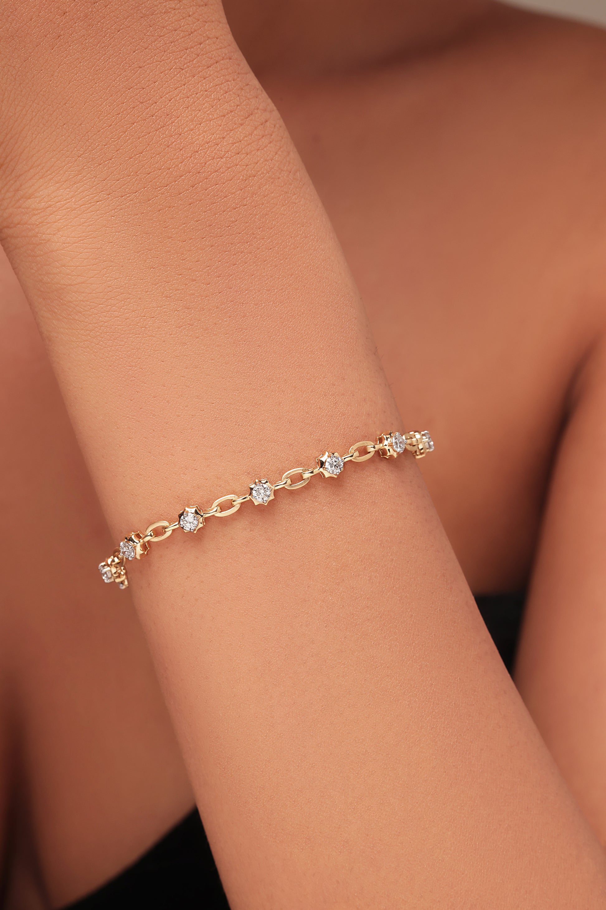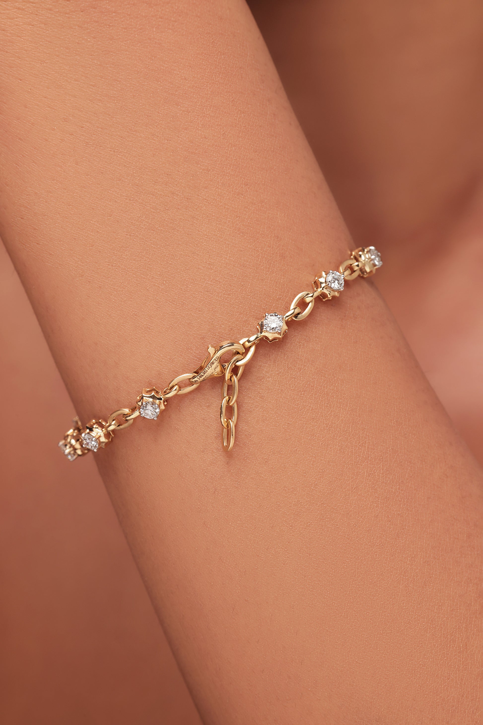 This lab grown diamond bracelet features classic Cuban link chains, with each individual link meticulously adorned with brilliant round lab grown diamonds. The diamonds are set in a pavé style, creating a continuous, sparkling surface.