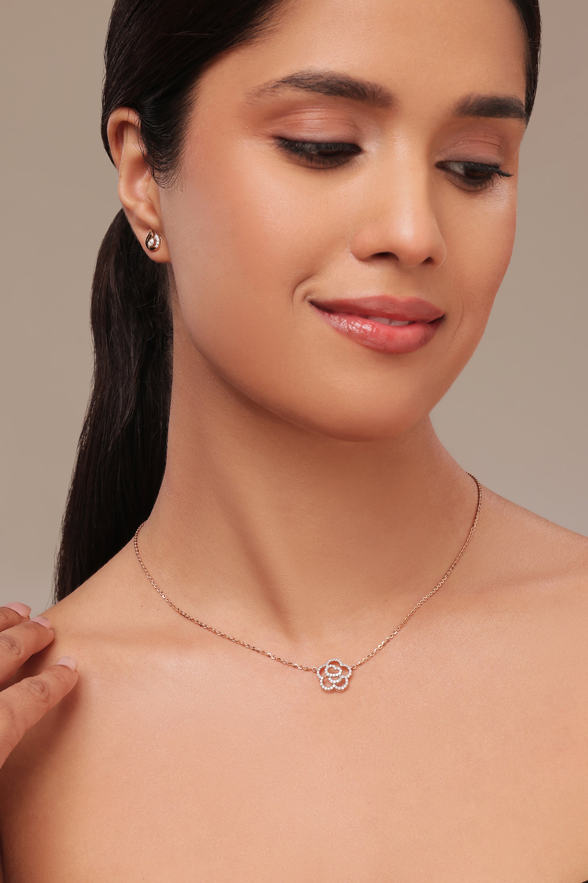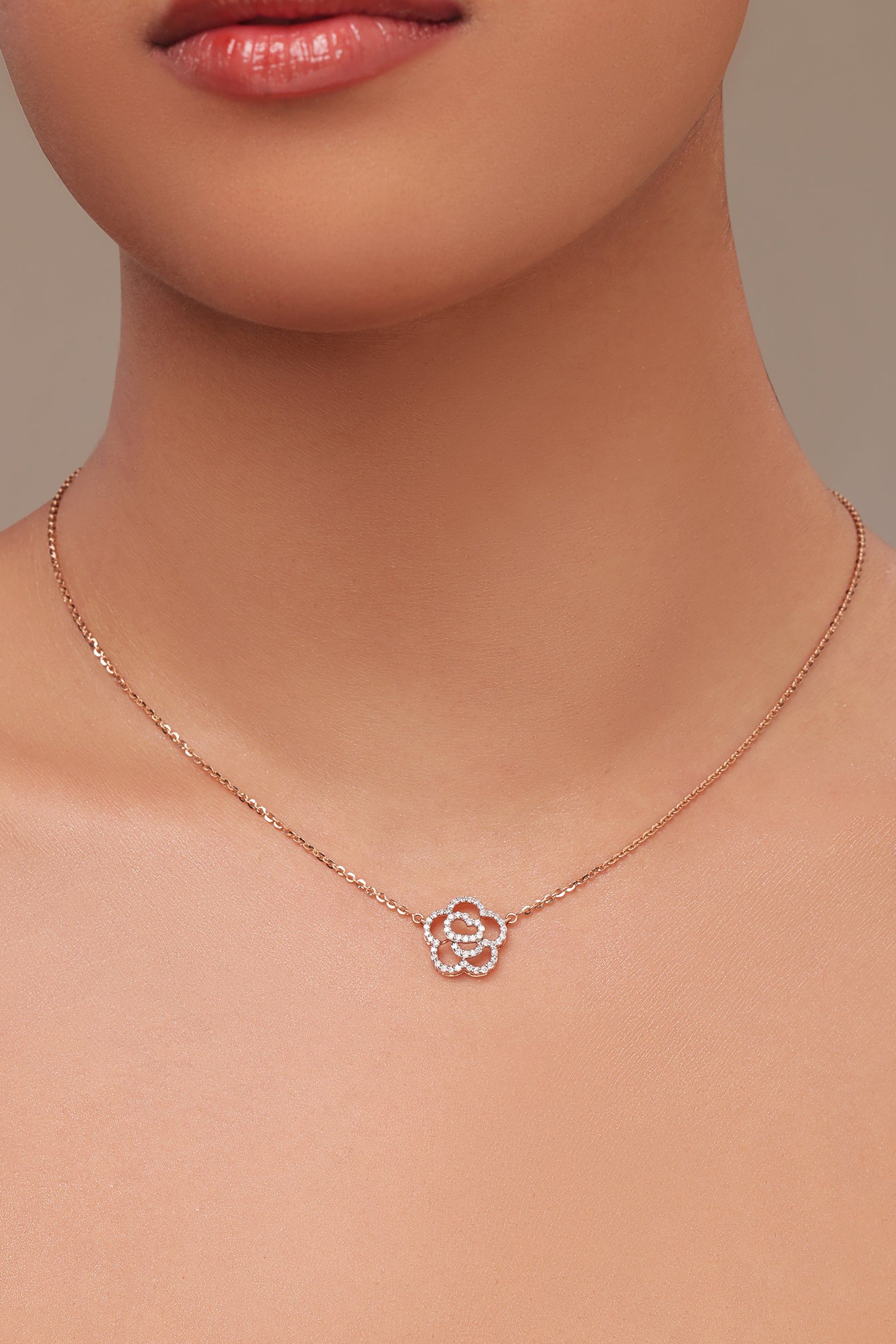 This refined diamond pendant features an intricate openwork floral design, outlined with sparkling lab grown diamonds. Its light, airy and flowing design sits gracefully along the neckline, adding a soft and graceful shimmer. Feminine, timeless, and easy to style , it offers a gentle touch of elegance for every day