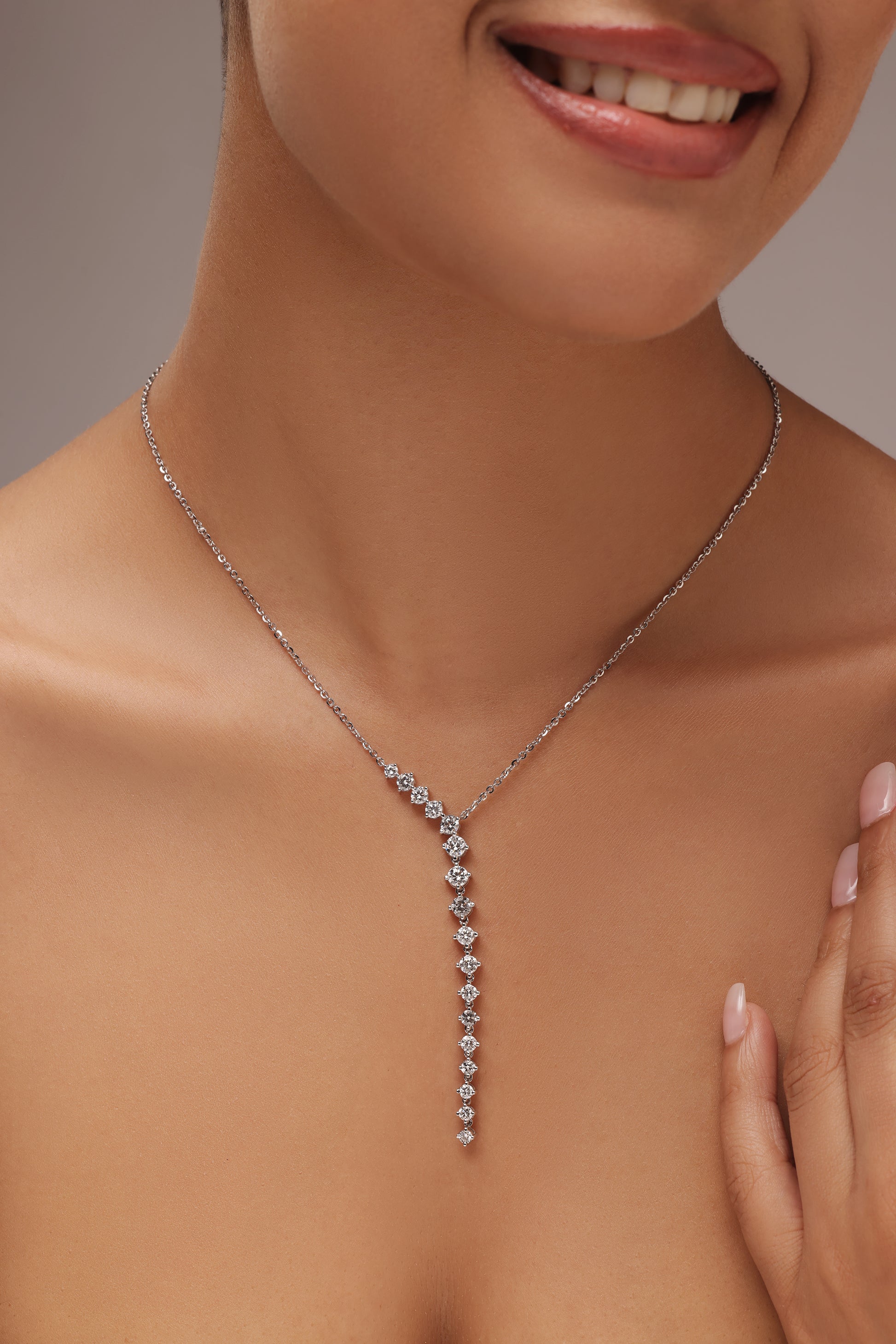 A gold lariat pendant featuring a cascading line of round lab grown diamonds, which are individually set and increase in size as they descend.