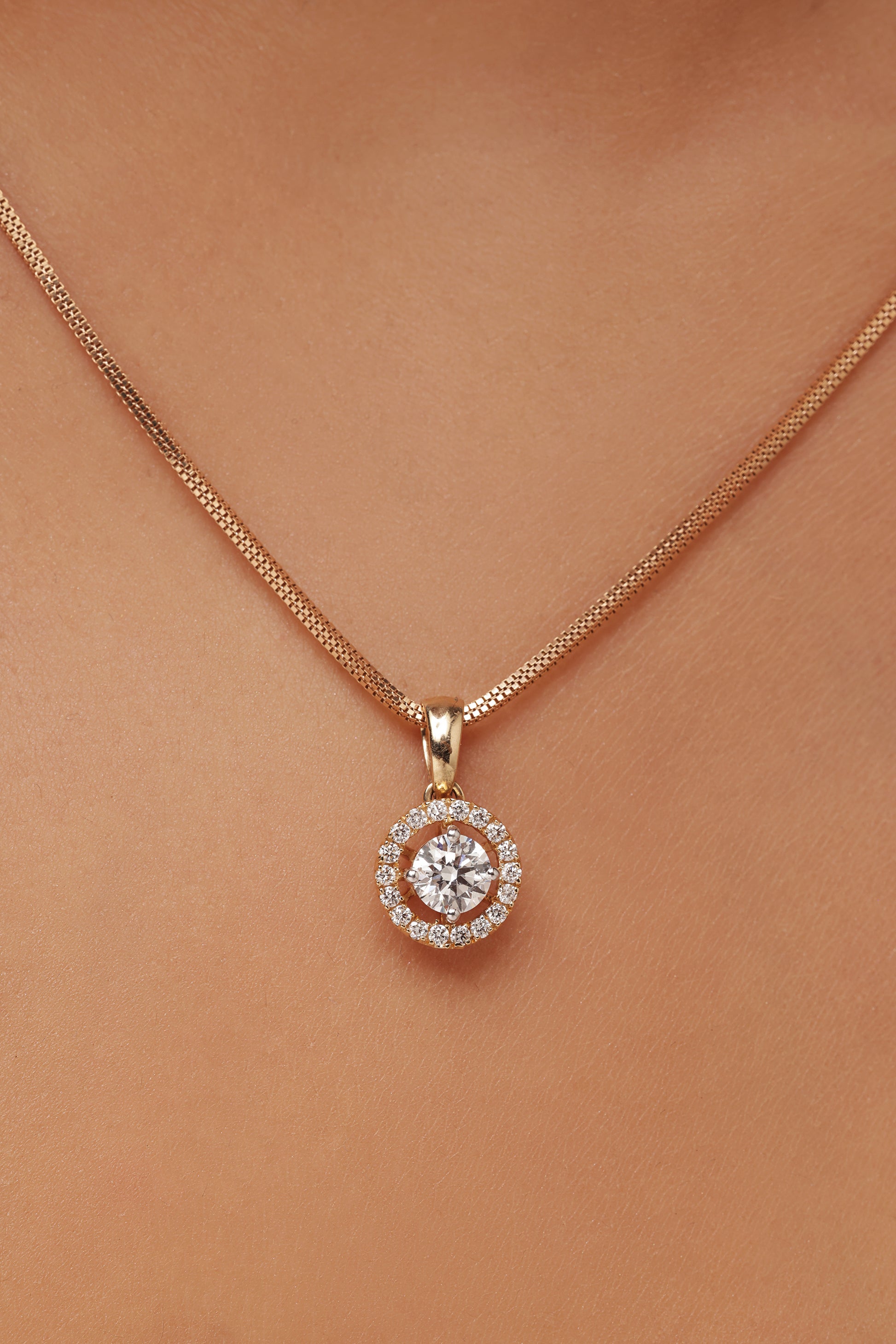 A classic gold pendant featuring a round pendant. A brilliant round-cut lab grown diamond is set at its center, surrounded by a sparkling halo of smaller diamonds.