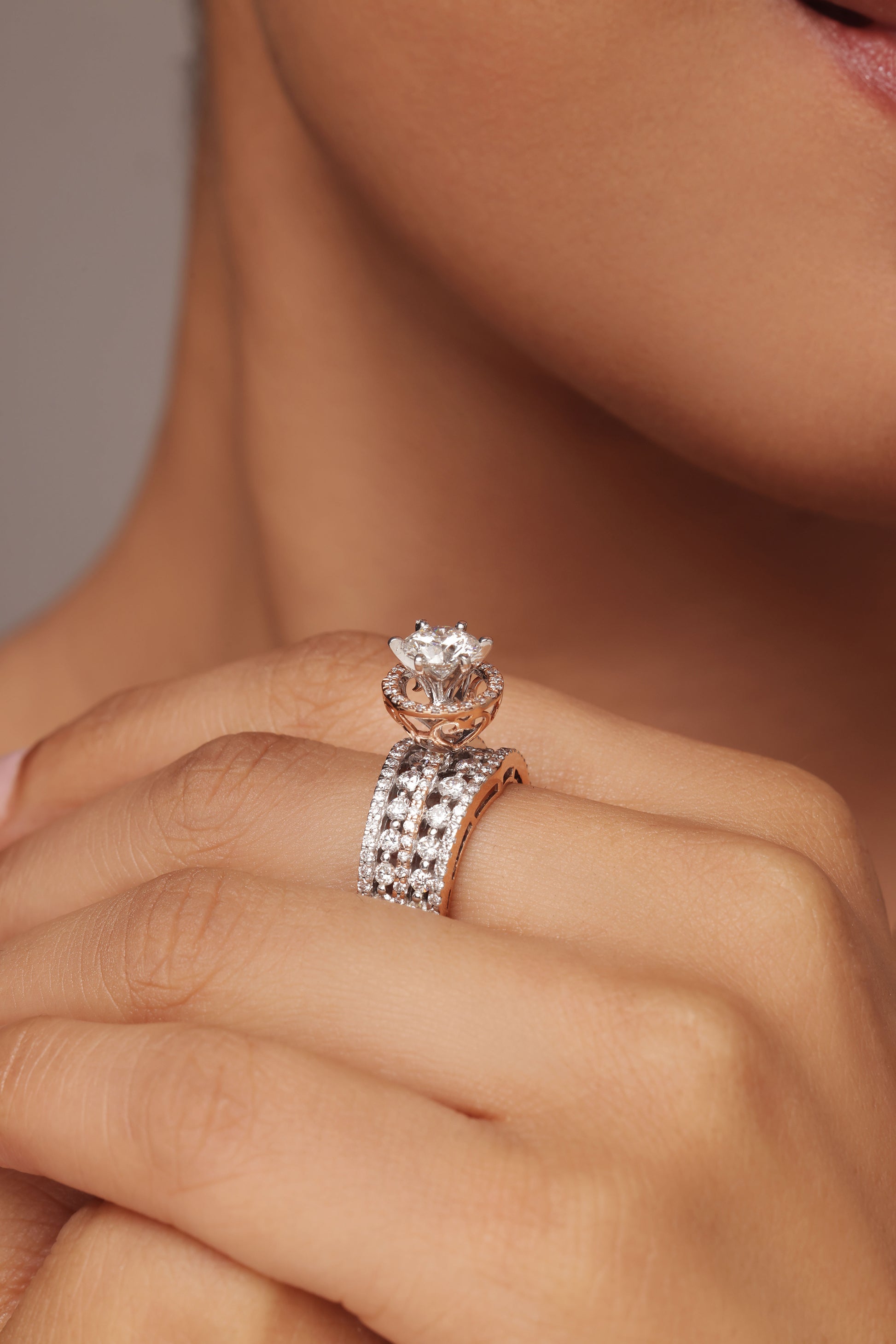 This opulent lab grown diamond cocktail ring features a prominent round brilliant-cut diamond, elevated and encircled by a sparkling halo setting of smaller diamonds. The wide, statement-making band is adorned with five rows of diamonds.