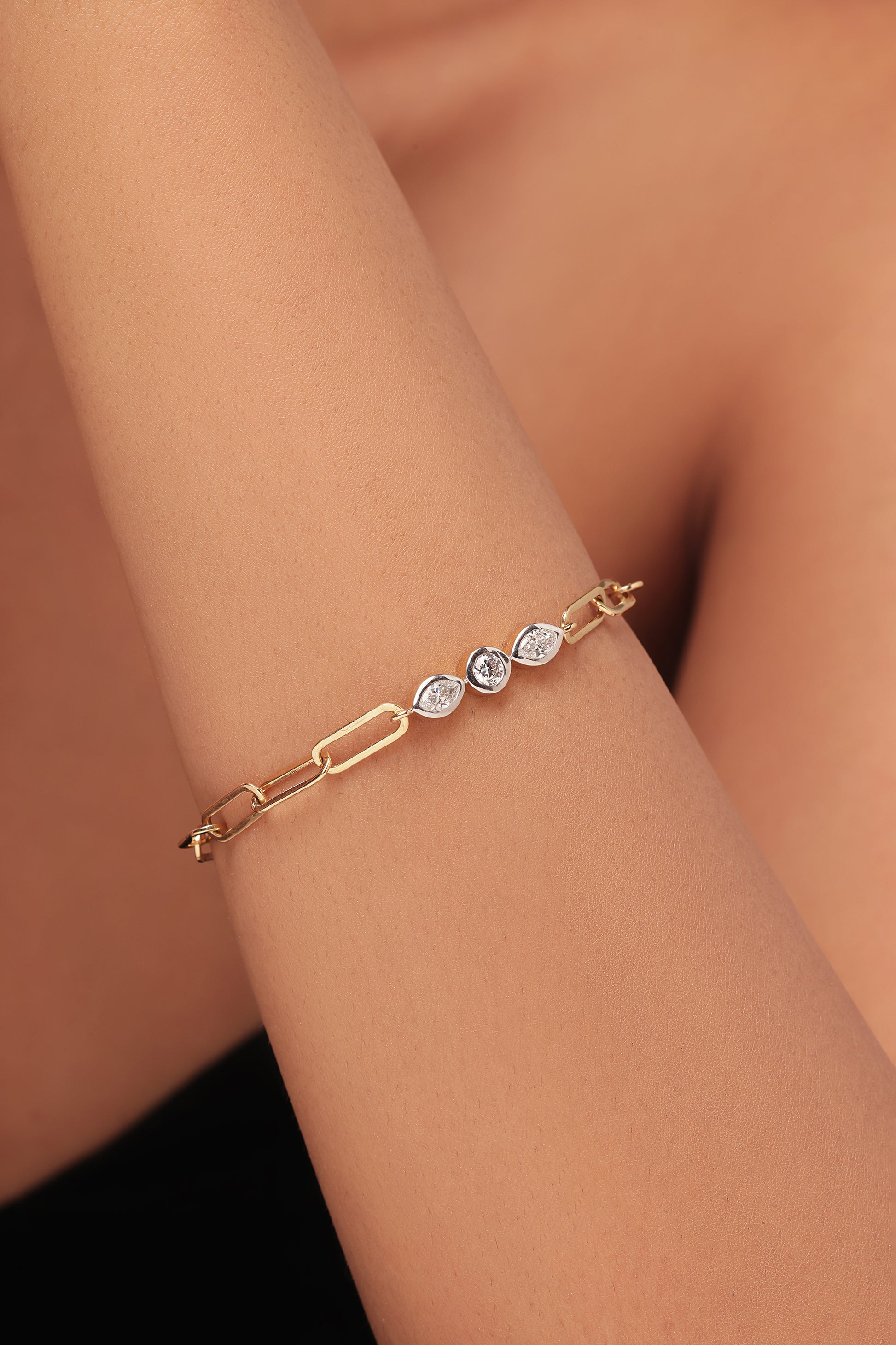 This lab grown diamond bracelet features a modern gold paperclip chain. It is set with a sparkling round lab grown diamond in the middle, flanked by two elegant marquise diamonds on either side. This creates a delicate and brilliant design that highlights the unique combination of diamond shapes.