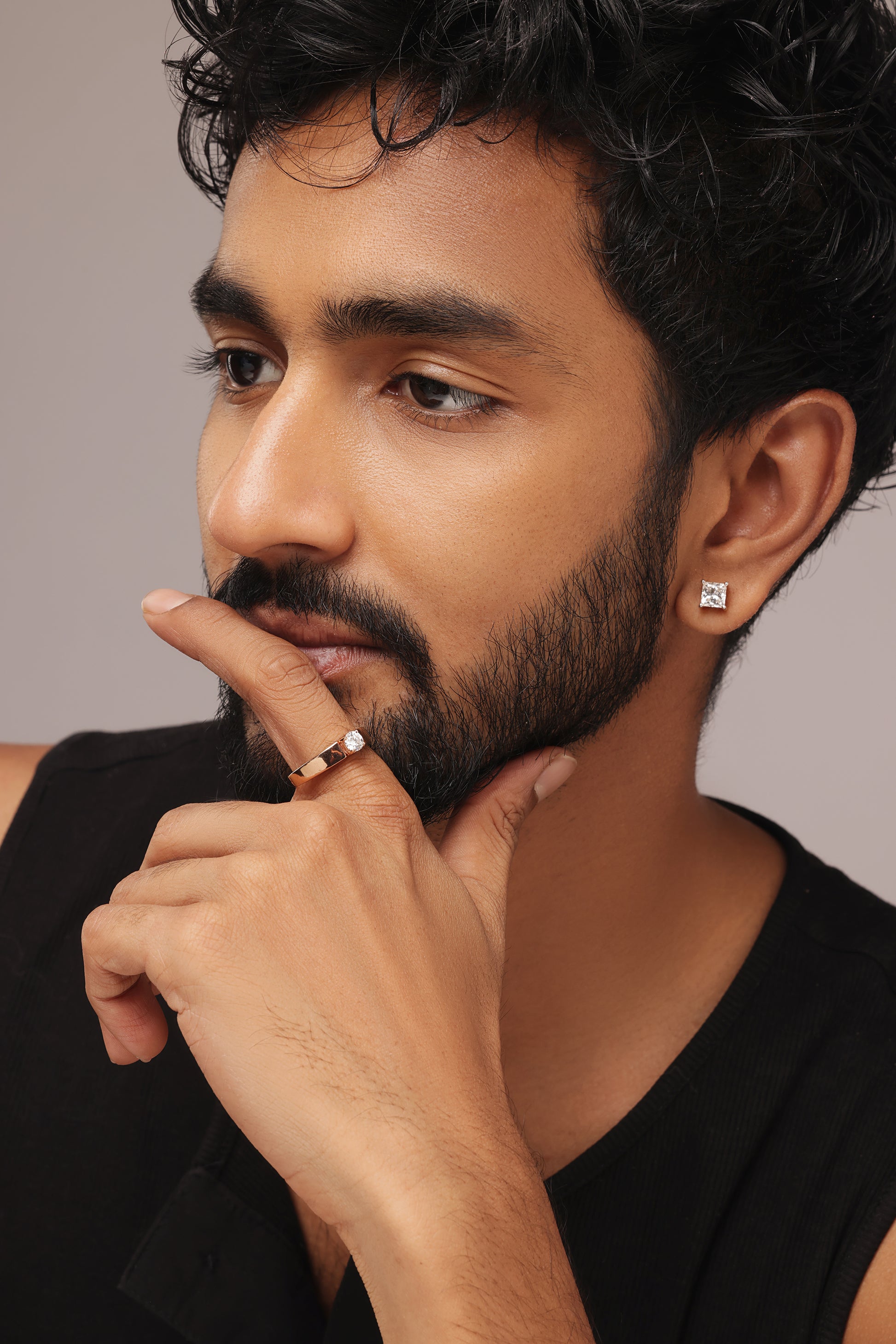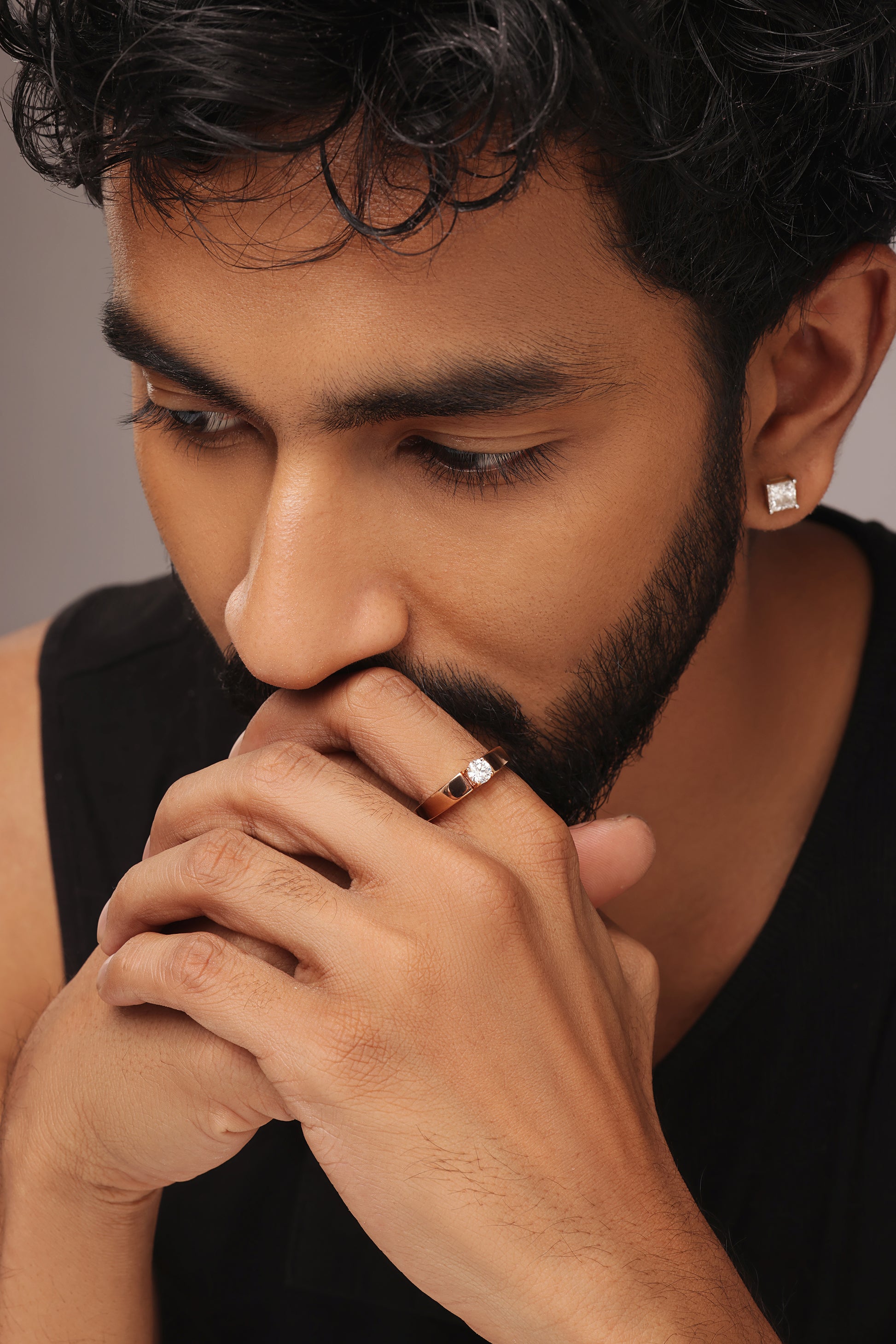 This simple and classic men's ring features a single, prominent round brilliant diamond at its center. The diamond is set in a secure bezel setting, which surrounds the stone with a smooth metal rim.