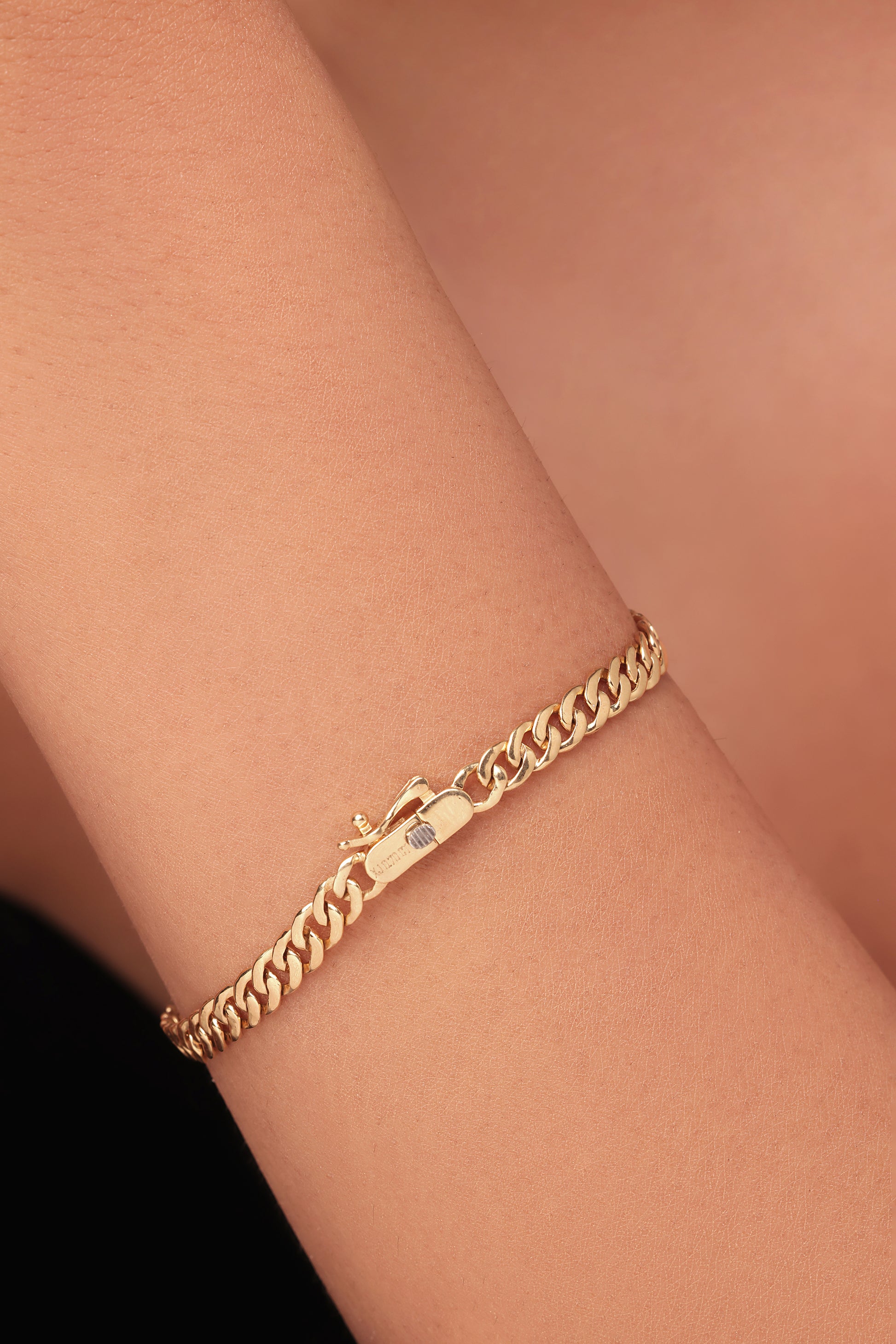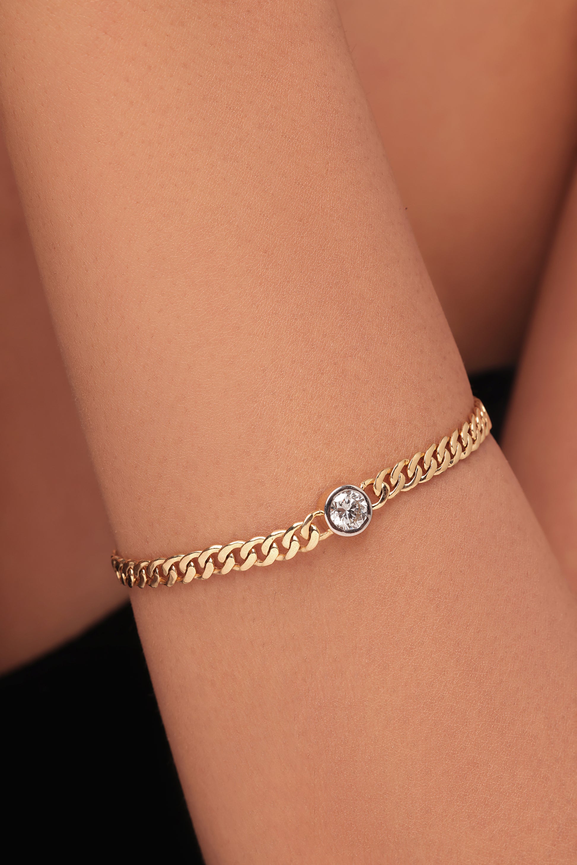 This minimalist yet elegant lab grown diamond Cuban chain bracelet features a prominent round-cut lab diamond as its sole embellishment. The lab grown diamond is centrally positioned along the robust Cuban chain.