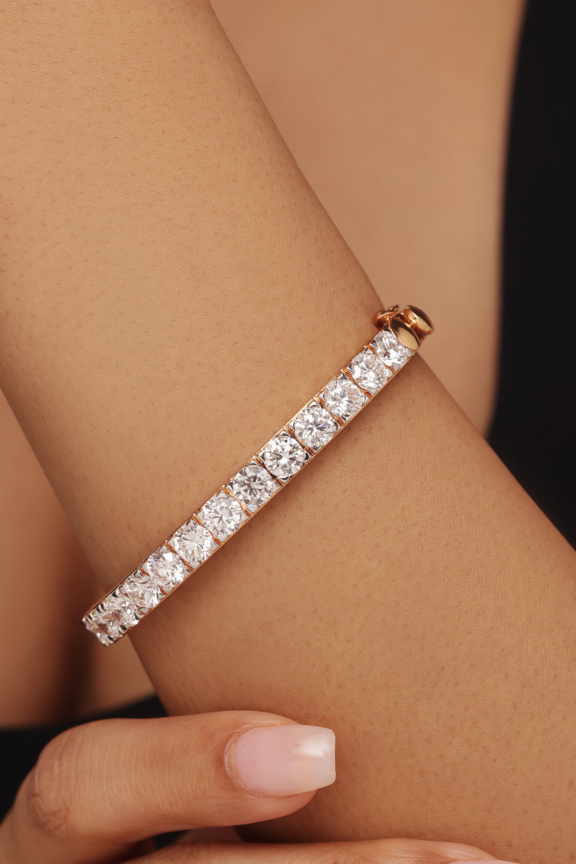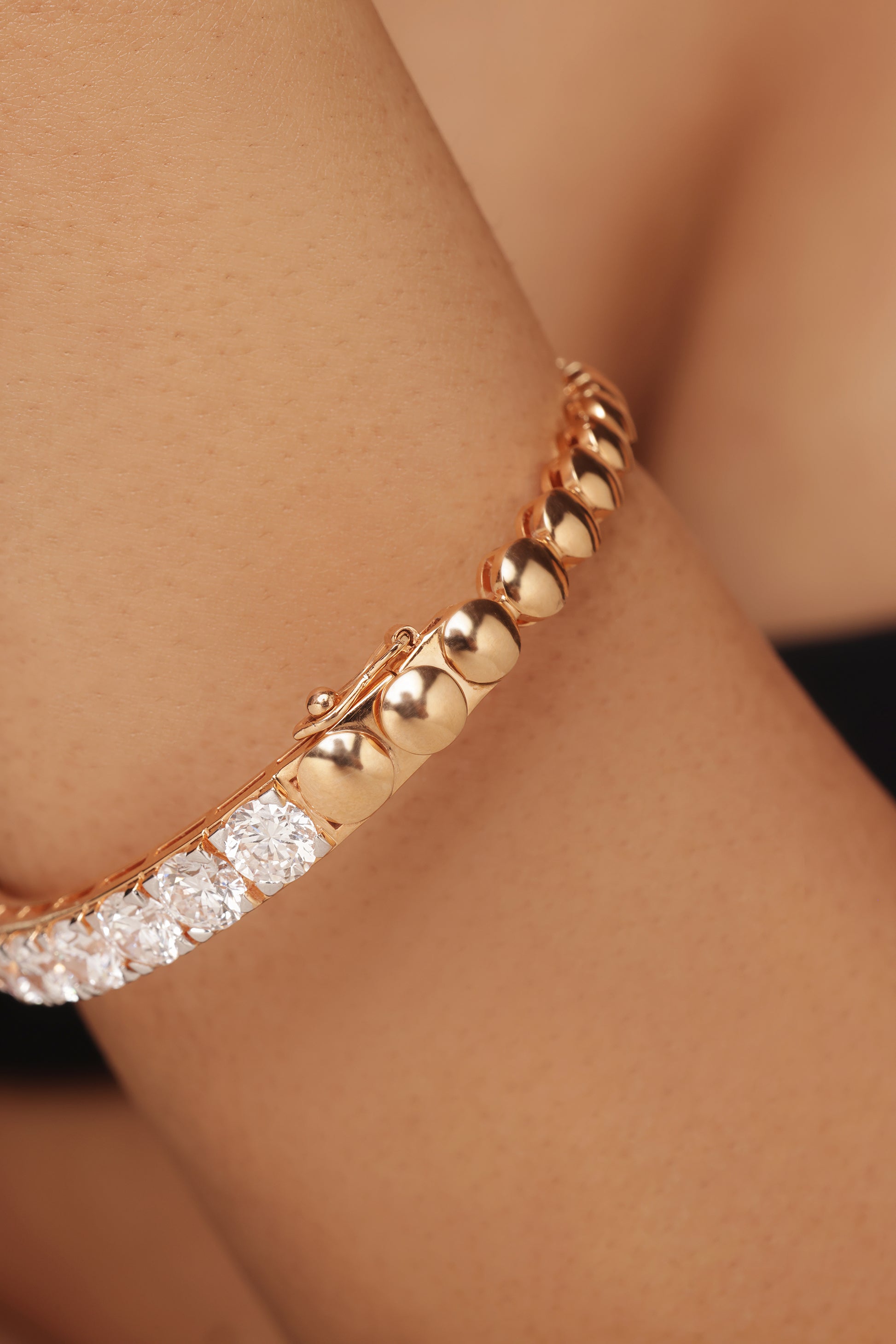 The lab grown diamond oval bracelet features a single row of round, brilliant lab diamonds, set closely together along its top surface in a tiger collet setting. It creates a continuous line of intense sparkle around the wrist.
