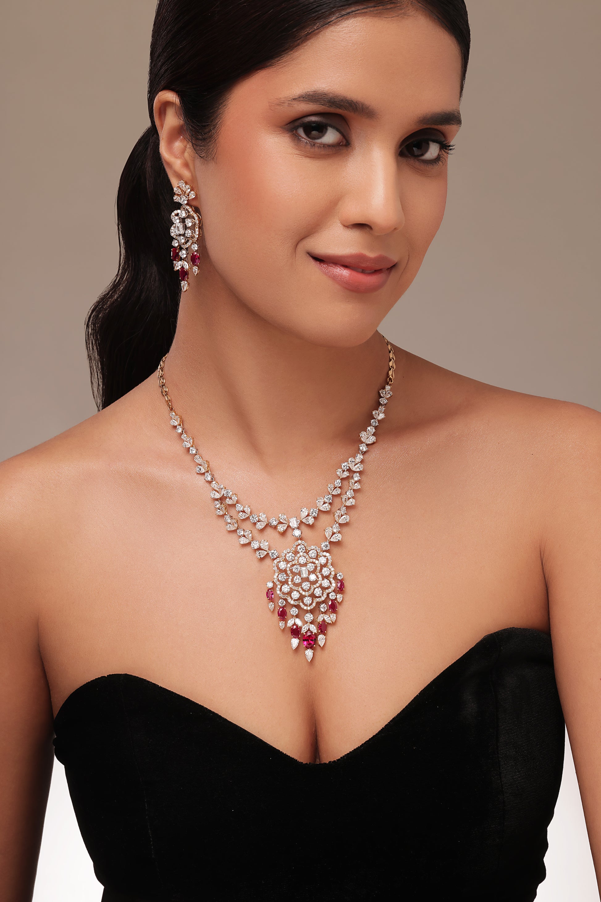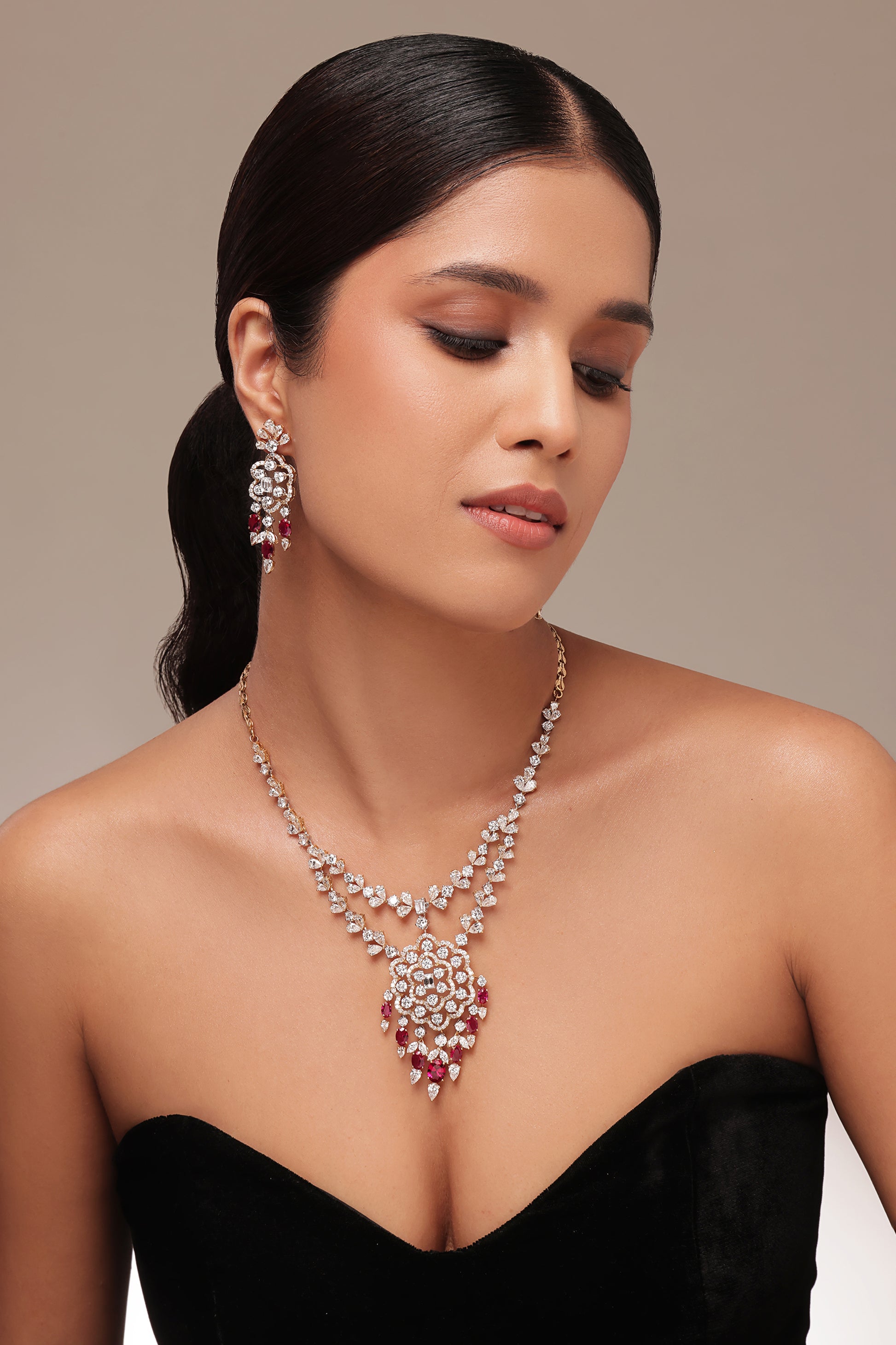 Elegant lab grown dimond necklace and earrings with shiny marquise, pear, round cut diamonds, highlighting vibrant ruby gemstone drops. The lab grown diamonds are held by a mix of prong and pavé settings, giving the set a sparkling and sophisticated look.