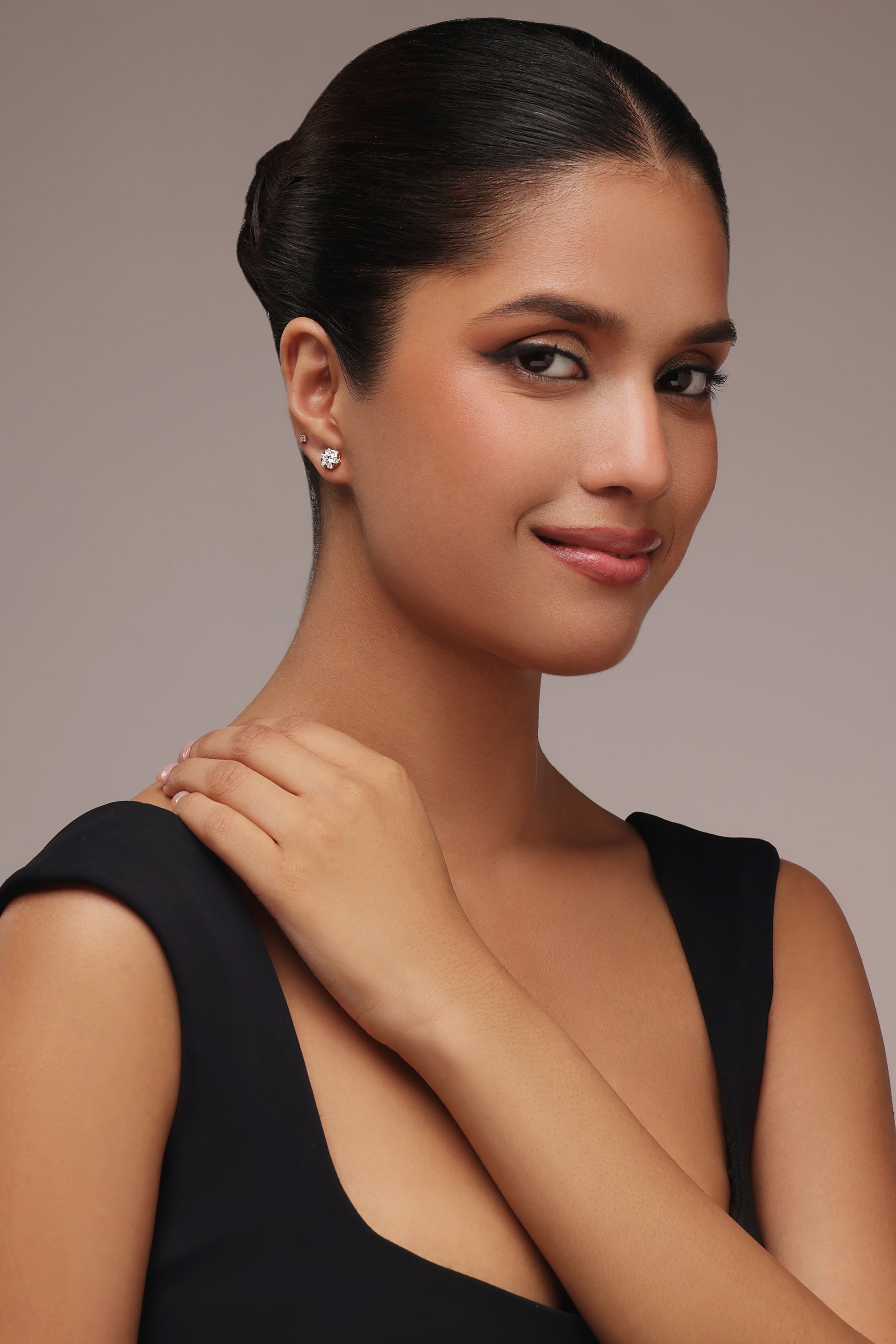 This elegant pair of lab-grown diamond earrings features a stunning cluster of seven individual round diamonds in each piece. The meticulous arrangement of the stones creates a captivating, larger-than-life sparkle that catches the light from every angle. These earrings are a perfect blend of timeless elegance and brilliant design, making them an ideal accessory for both special occasions and everyday luxury.