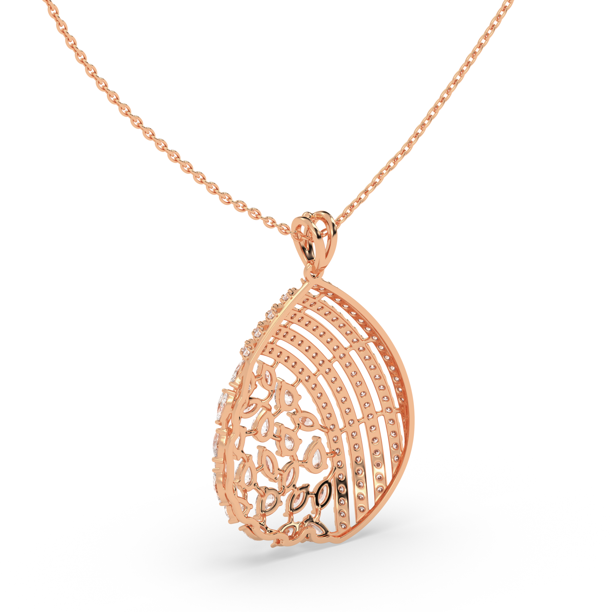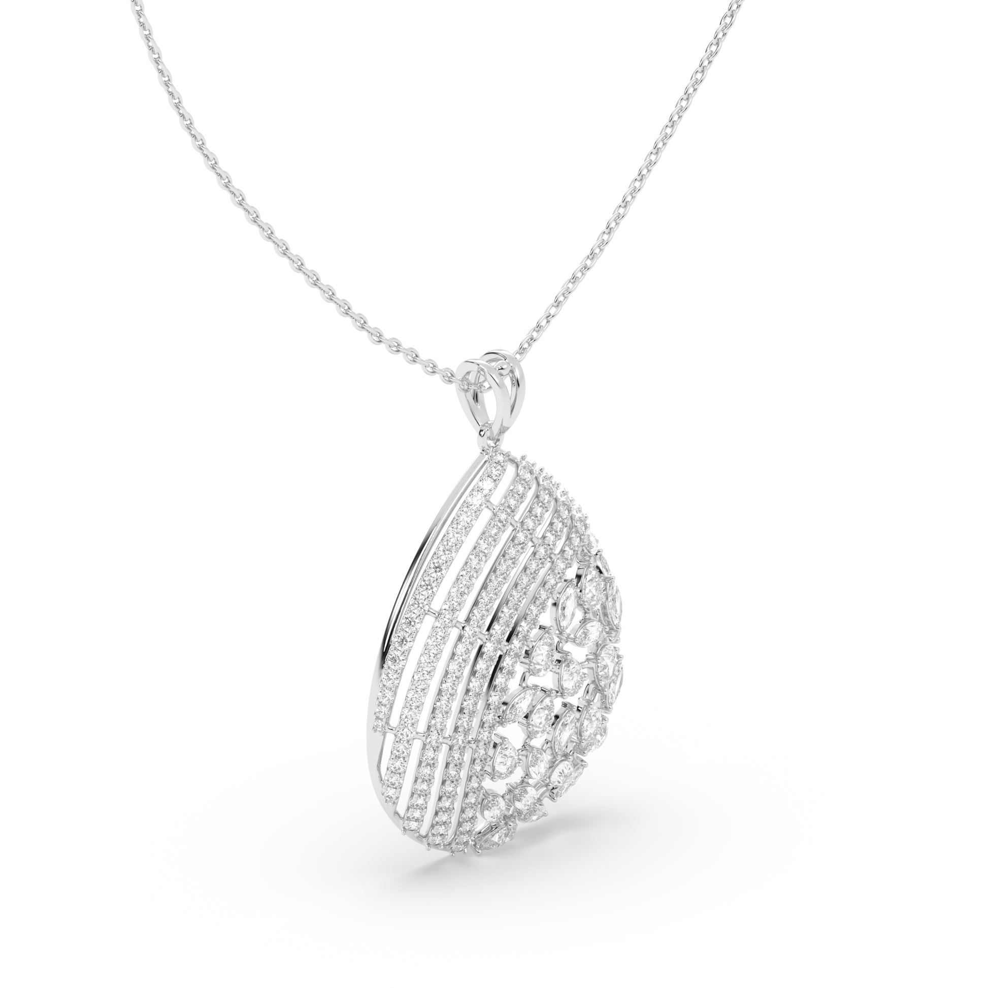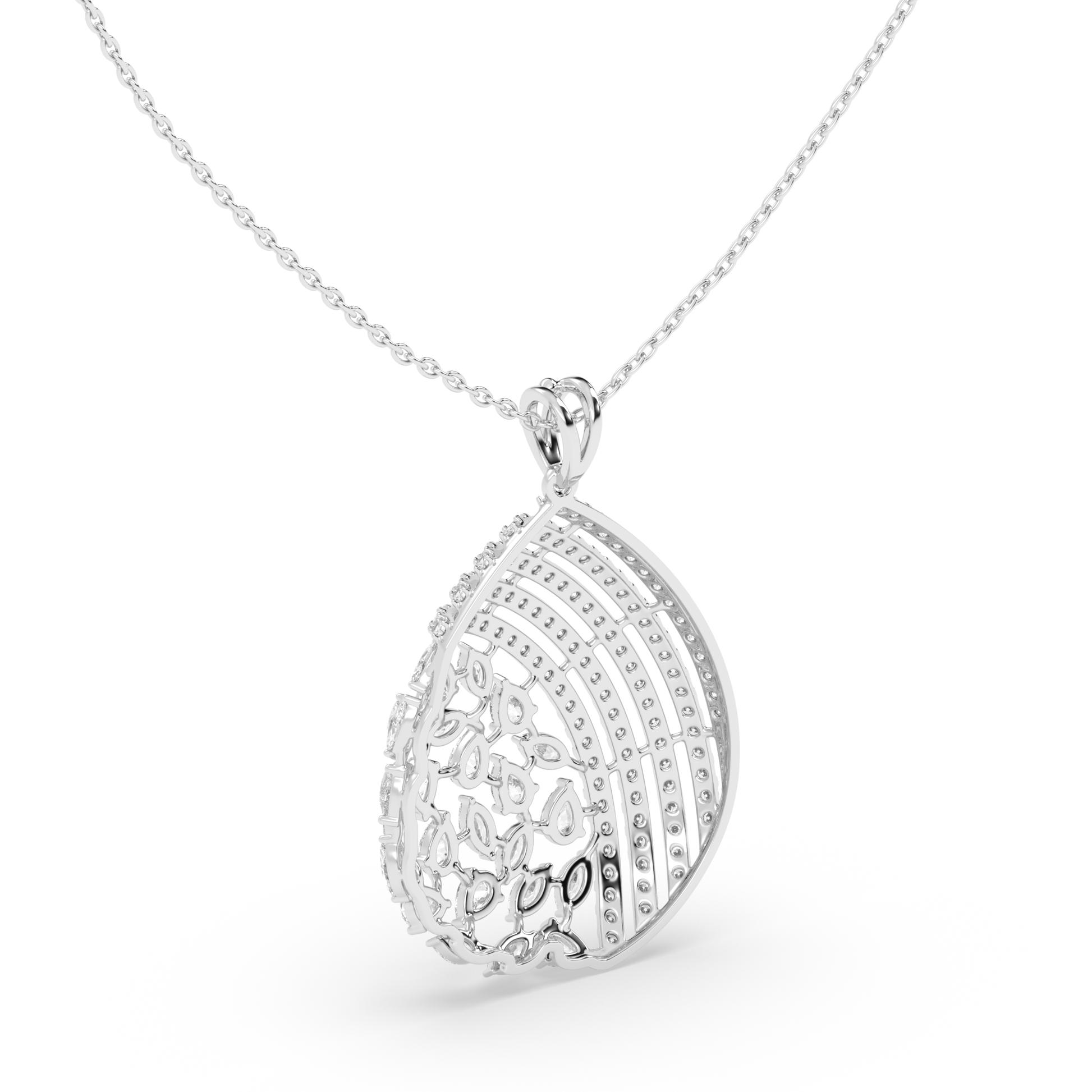 This diamond drop pendant necklace is crafted to highlight detailed artistry and graceful design. The pendant features a layered, openwork form with rows of shimmering lab-grown diamonds that flow into a delicate lattice of marquise-cut stones. The combination of curved lines and fine detailing creates depth, movement, and light from every angle. This statement piece rests beautifully on the neckline, making it an elegant choice for evenings, celebrations, or moments that call for refined luxury.