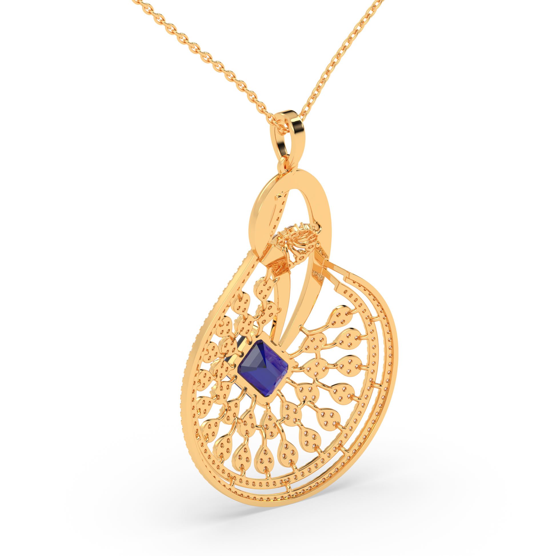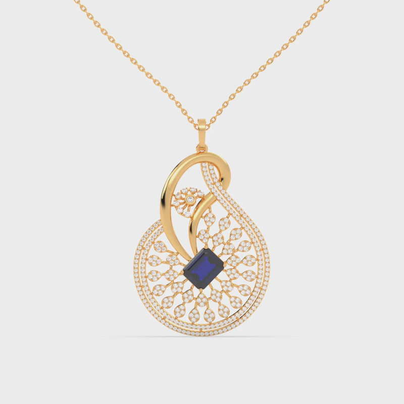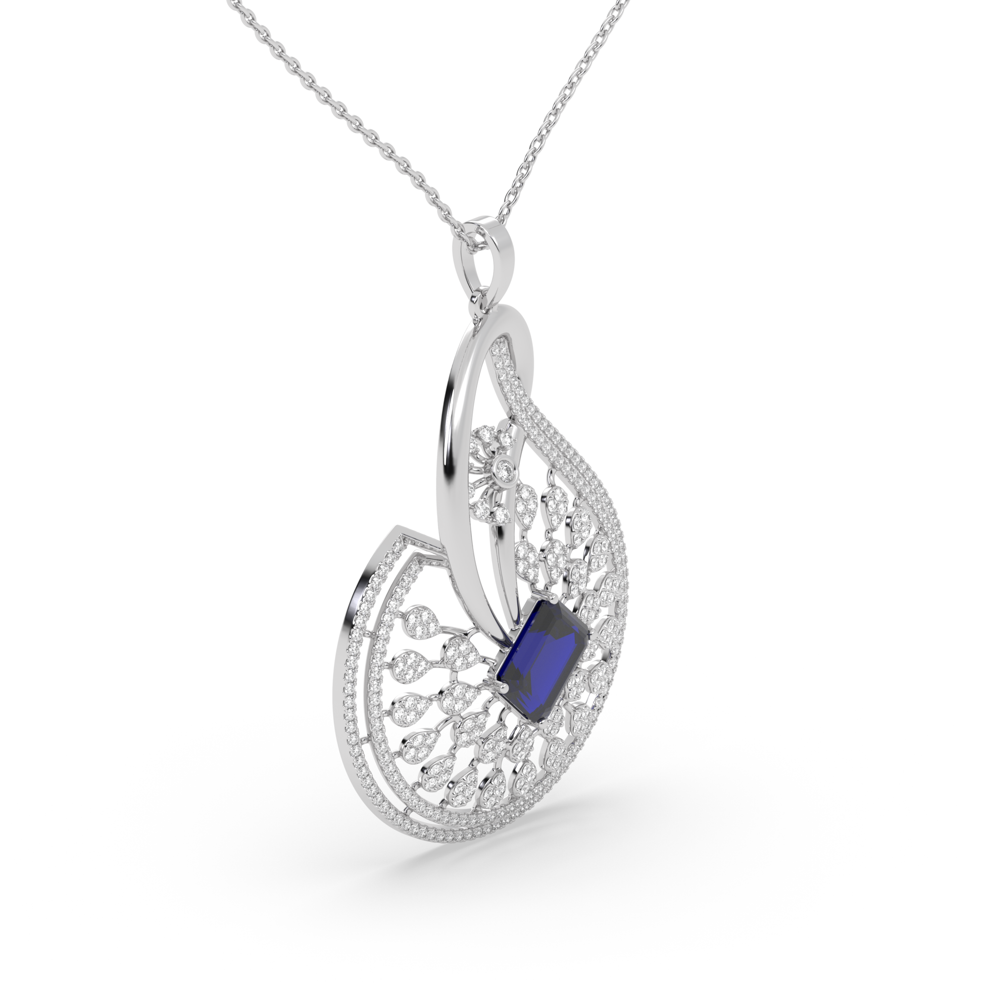 This pendant has a soft, flowing design that feels elegant and balanced. At the centre is a deep blue sapphire, cut in a clean rectangular shape, giving the piece a calm and timeless look. The small diamonds set around the sapphire feels airy and graceful, while the gentle curve at the top adds movement and depth. Every detail reflects careful craftsmanship and a respect for proportion - designed to be admired up close, yet feet instinctively when worn.