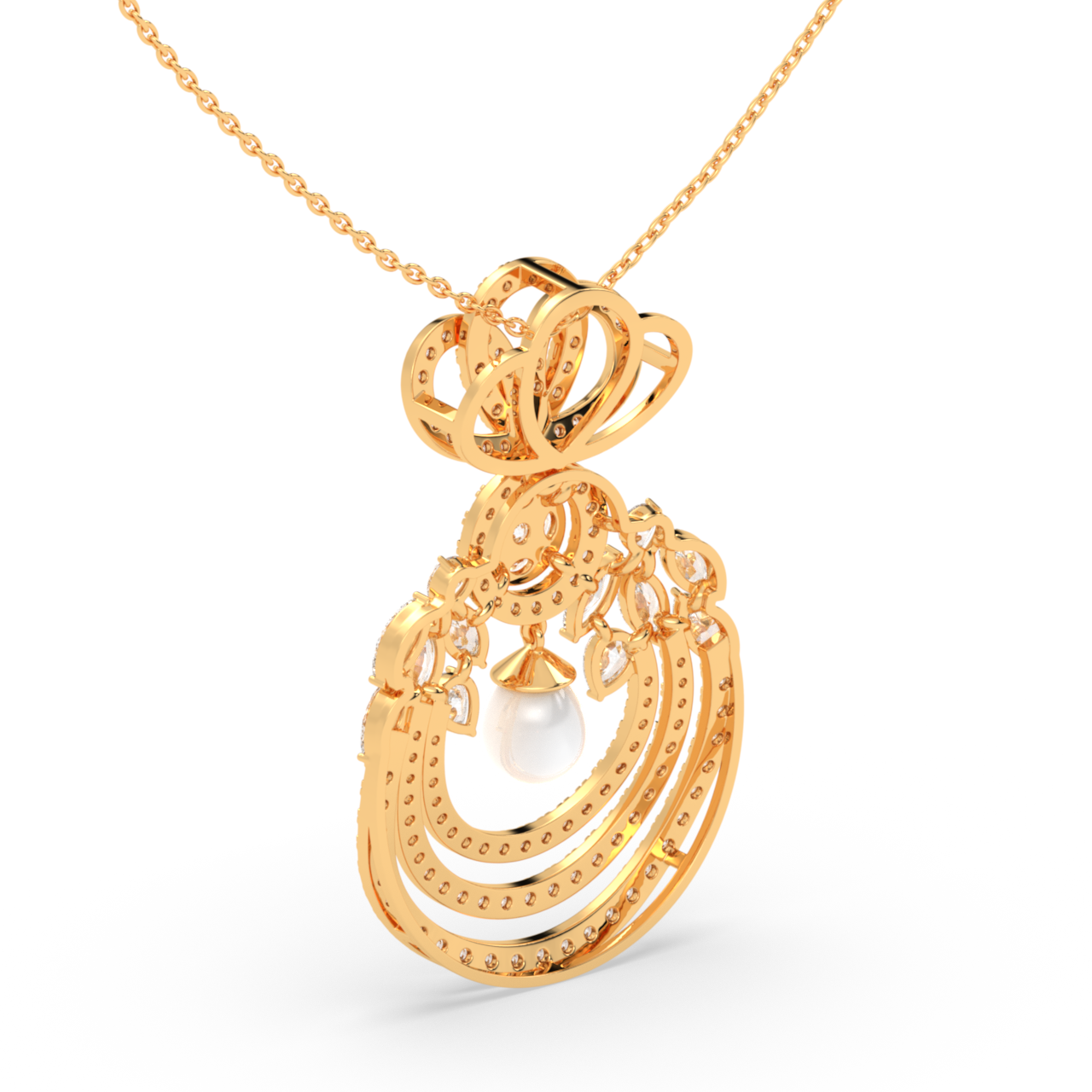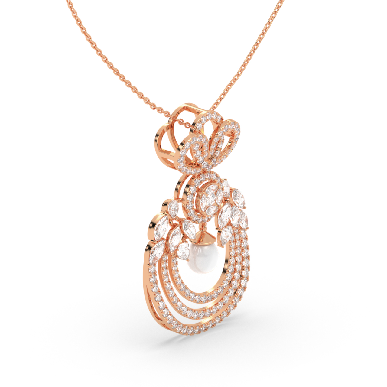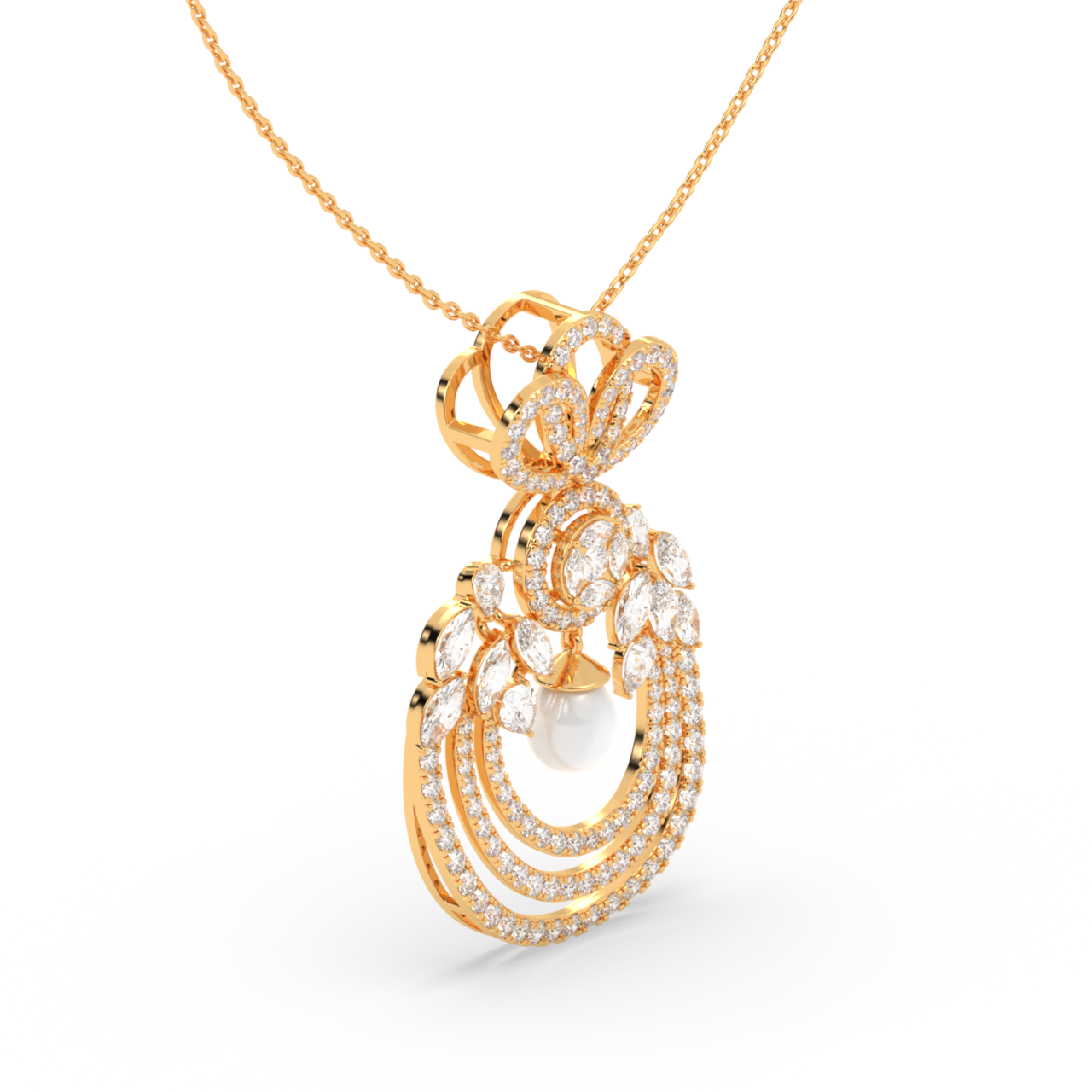 This diamond pendant necklace is a graceful blend of classic charm and refined detail. Crafted in a rich gold finish, the design features layered diamond-studded curves that create depth and soft movement, complemented by delicate leaf-like accents set with shimmering lab-grown diamonds. At the centre, a subtle pearl drop adds a touch of elegance and contrast, enhancing the overall harmony of the piece.